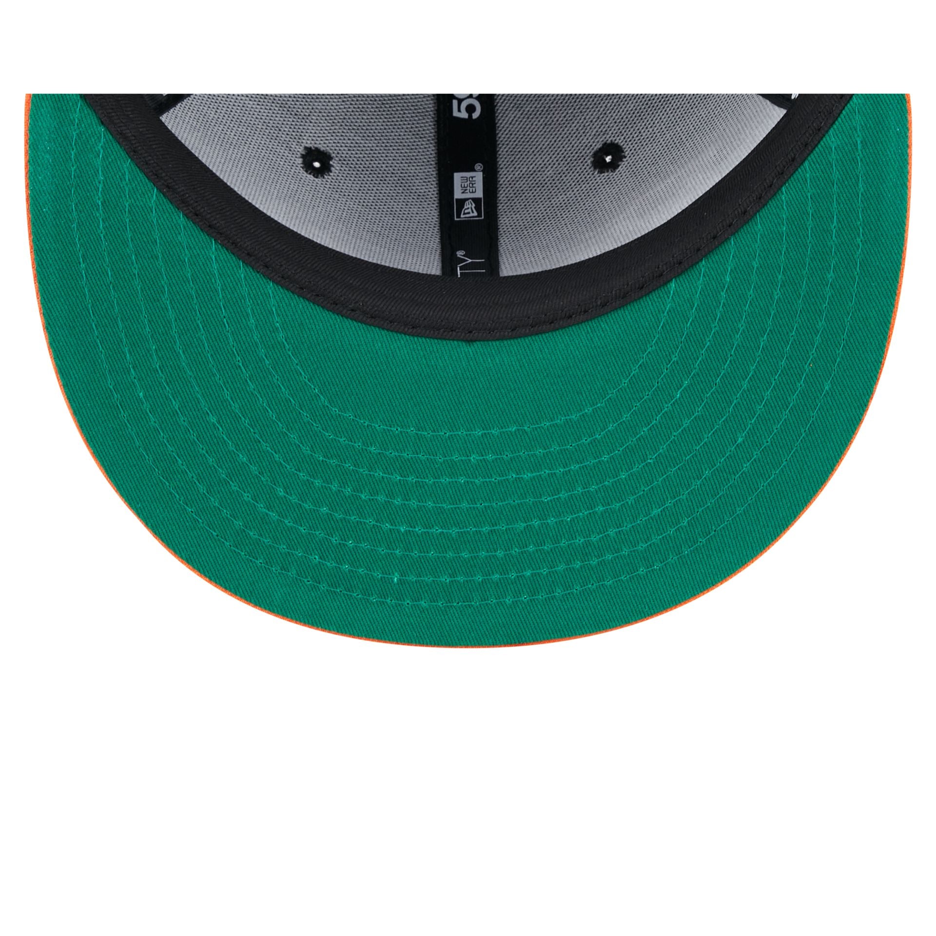 The Denver Broncos Faux Leather Crown 59FIFTY Fitted Cap features an embroidered Broncos wordmark at the front panels with a matching NFL Shield at the rear. an orange visor. and green undervisor.