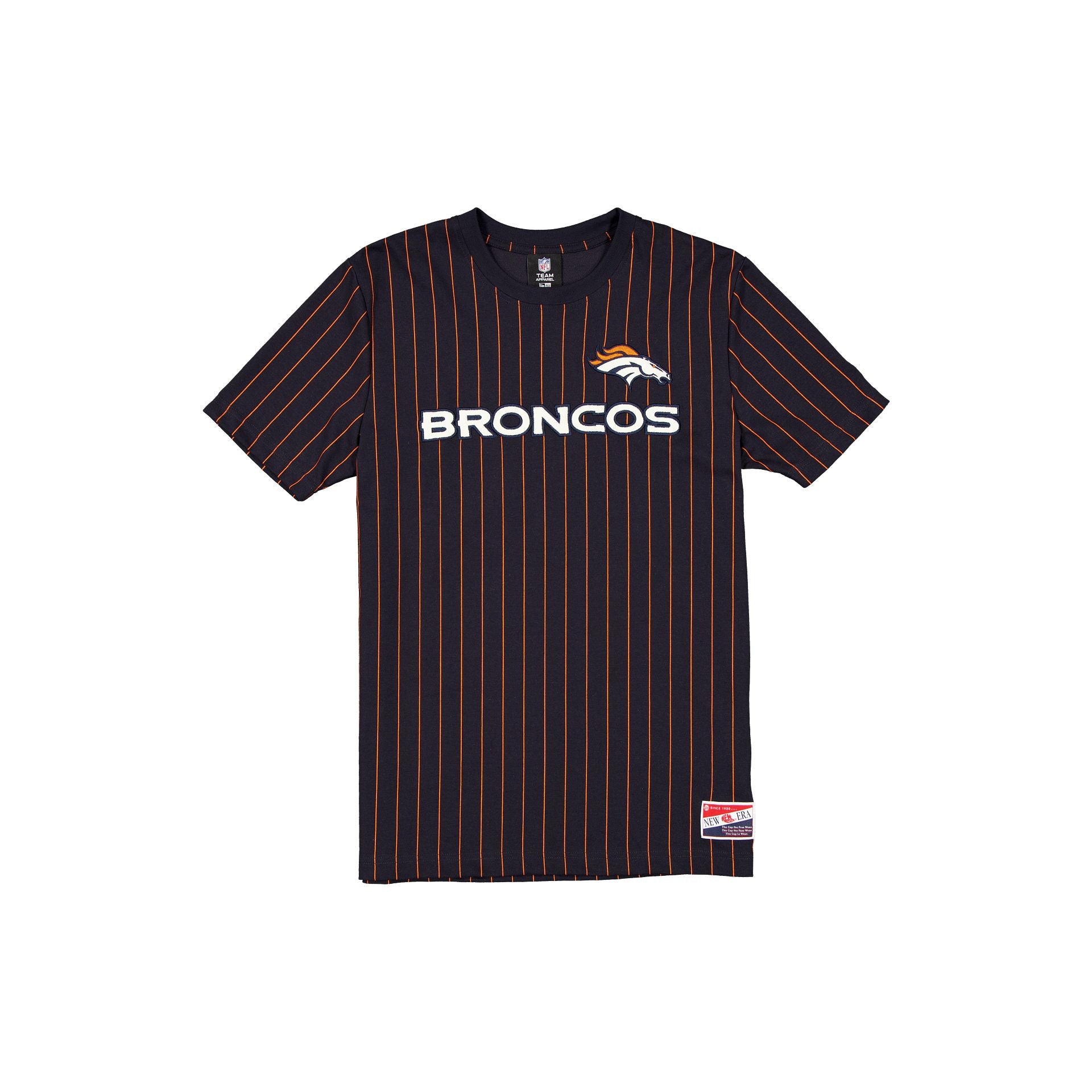 The Denver Broncos Throwback Retro Pinstripe T-Shirt features an embroidered Broncos wordmark at the front with a twill applique logo at the left chest.