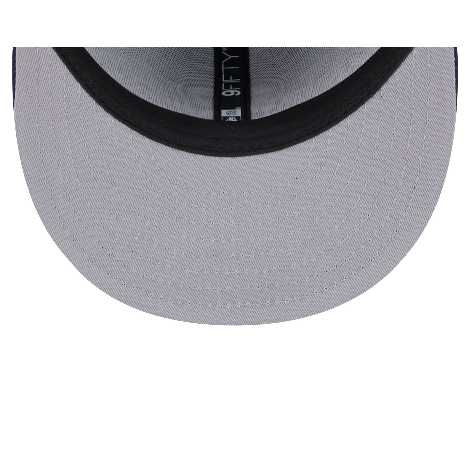 The Denver Nuggets Kids 9FIFTY Snapback Hat features an embroidered Nuggets wordmark at the front panels with a matching team logo at the right-wear side. Additional details include a gray undervisor and a snapback closure at the rear.