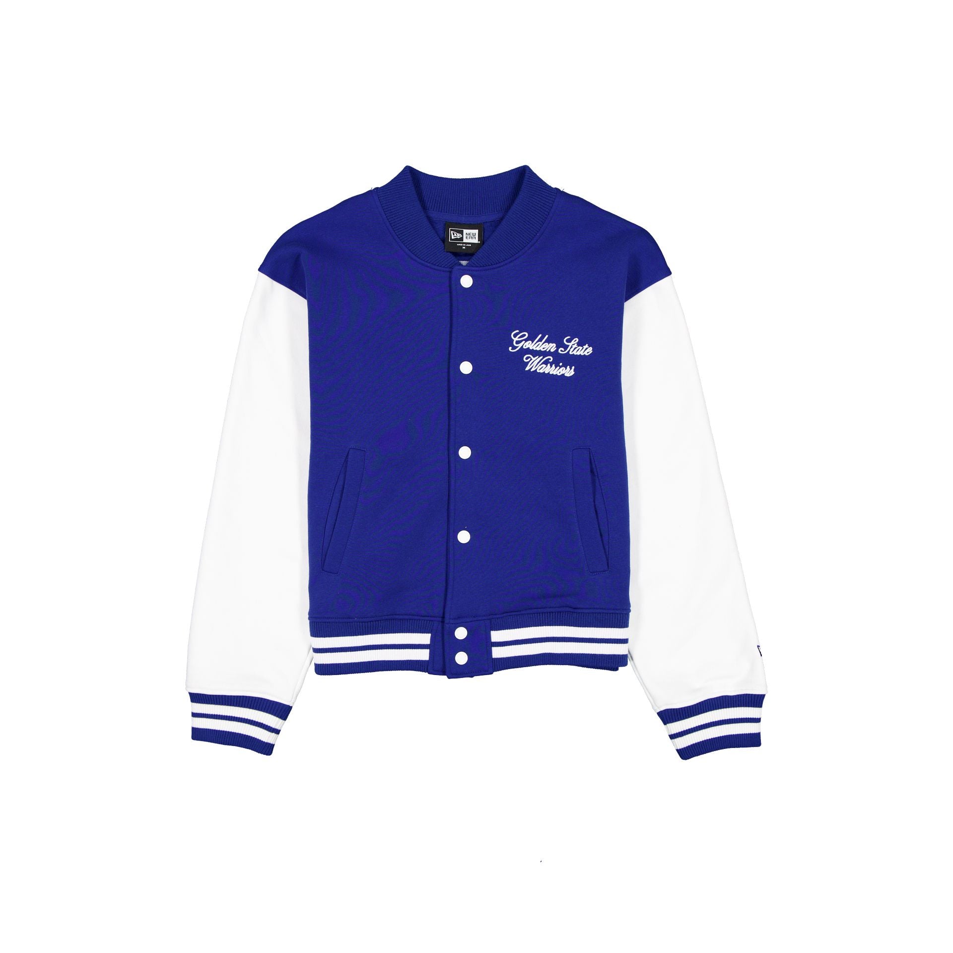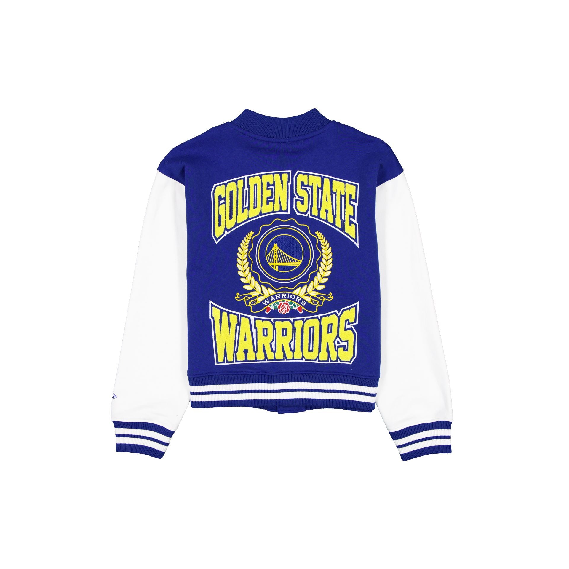 The Golden State Warriors Throwback Prep Women’s Jacket features a chain-stitched Warriors script at the left chest with a snap front closure and a chenille applique wordmark with team emblem at the rear.