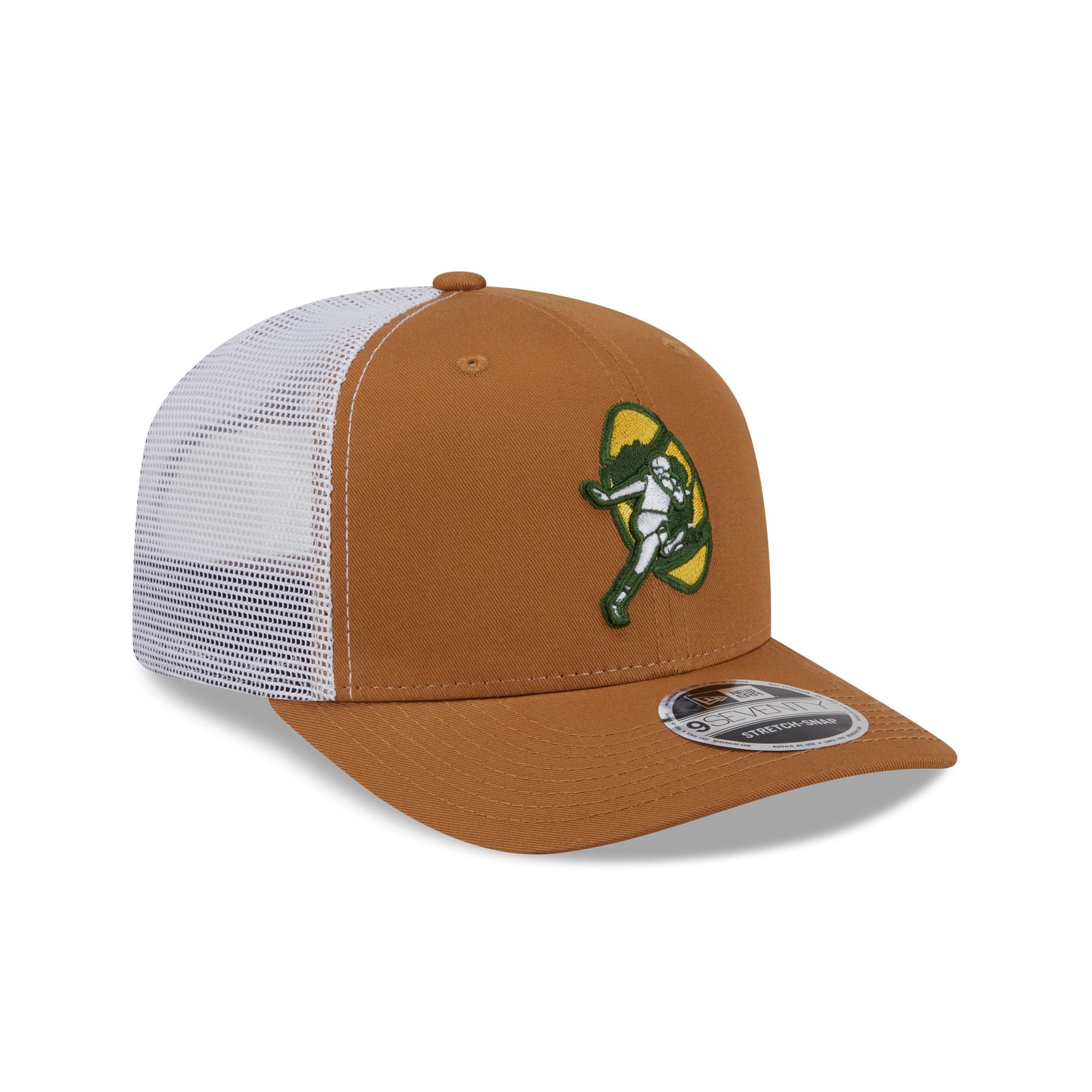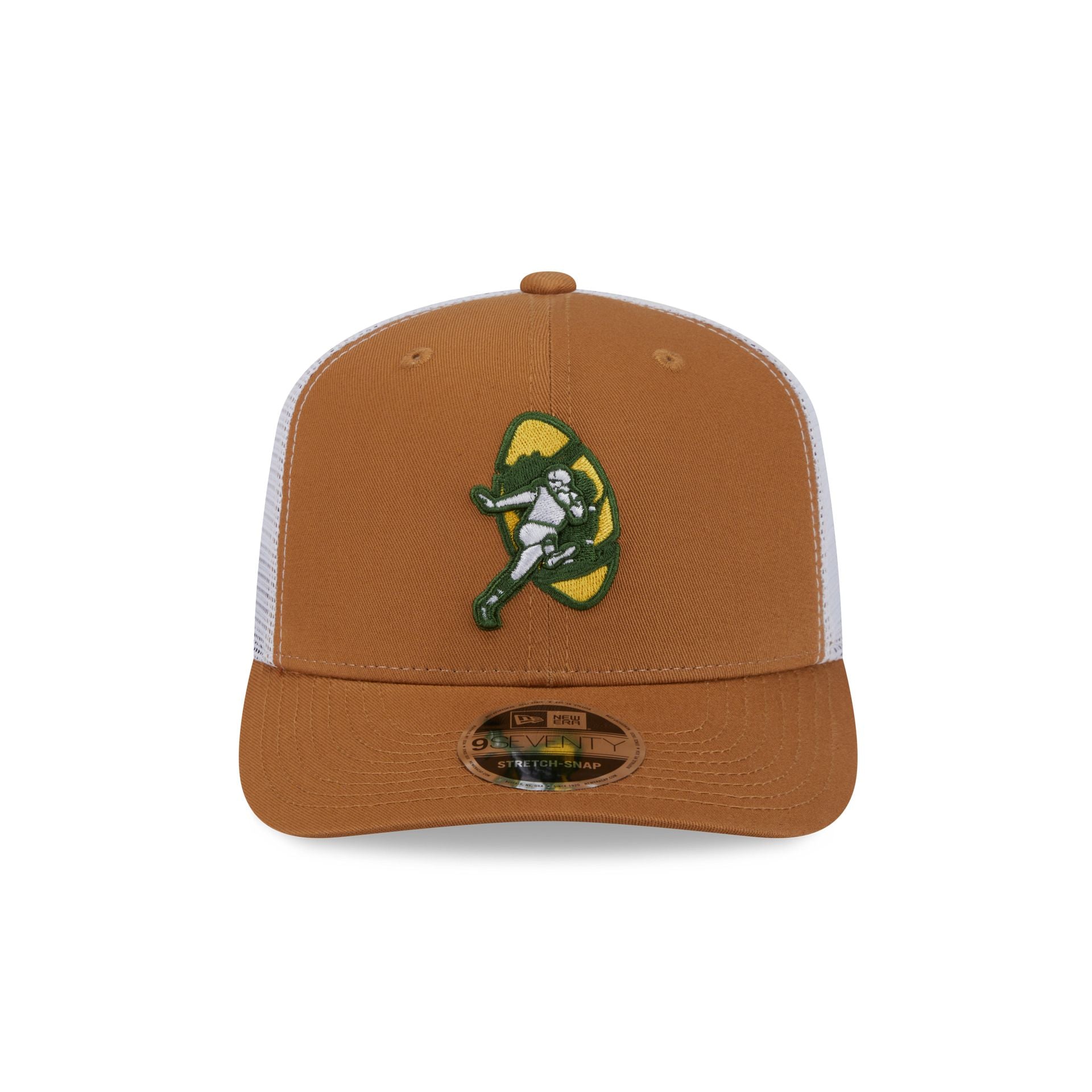 The Green Bay Packers Bronze 9SEVENTY Trucker features an embroidered Packers Historic logo at the front panels with a matching woven team tag at a snapback closure at the rear.