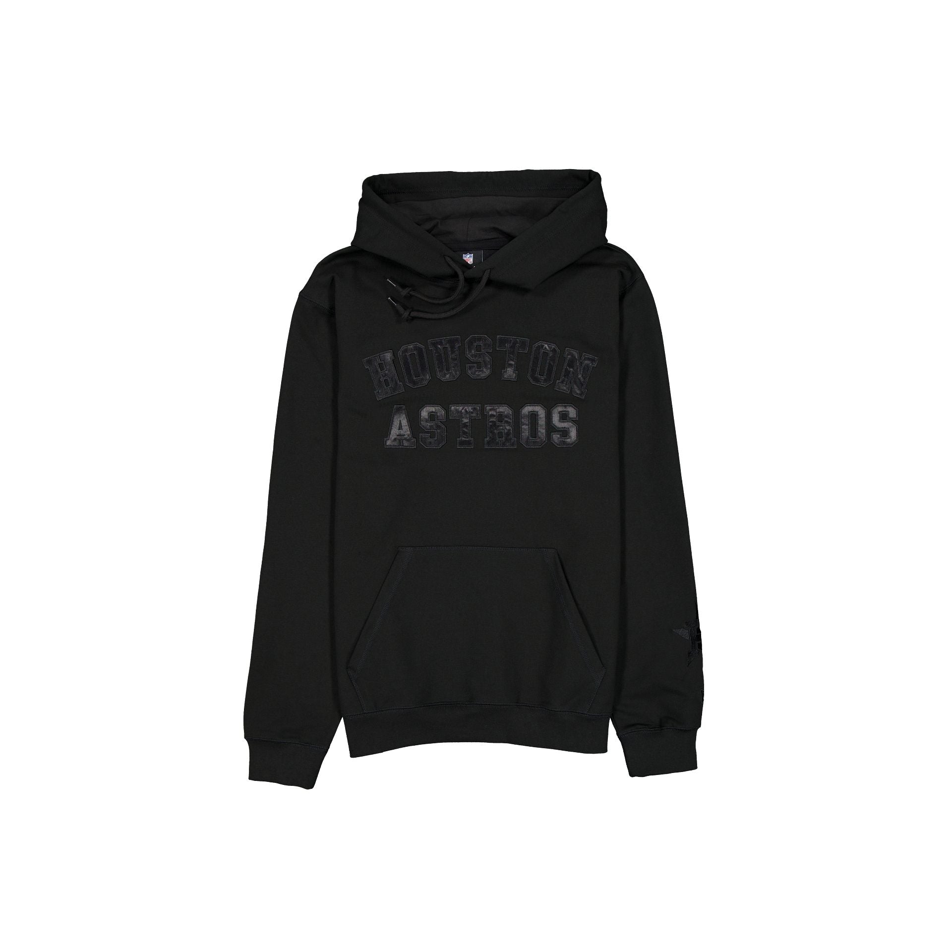 The Houston Astros Black on Black Logo Select Hoodie features a satin applique with a tonal stitch Astros wordmark at the chest and an embroidered team logo at the left-wear sleeve.