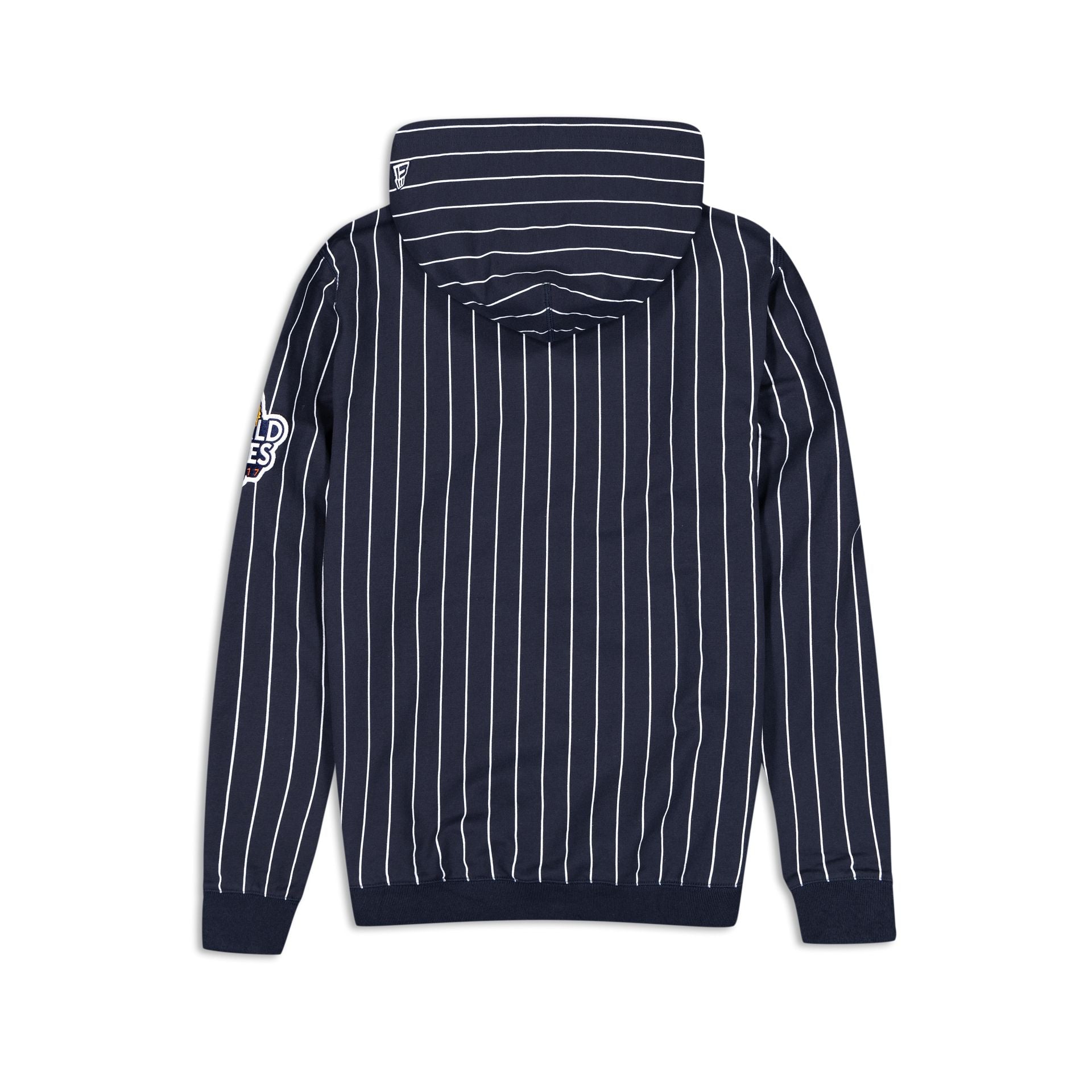 The Houston Astros Logo Select Pinstripe Hoodie features a chenille applique Astros logo at the left chest with team patches at each sleeve and an embroidered team wordmark at the rear.