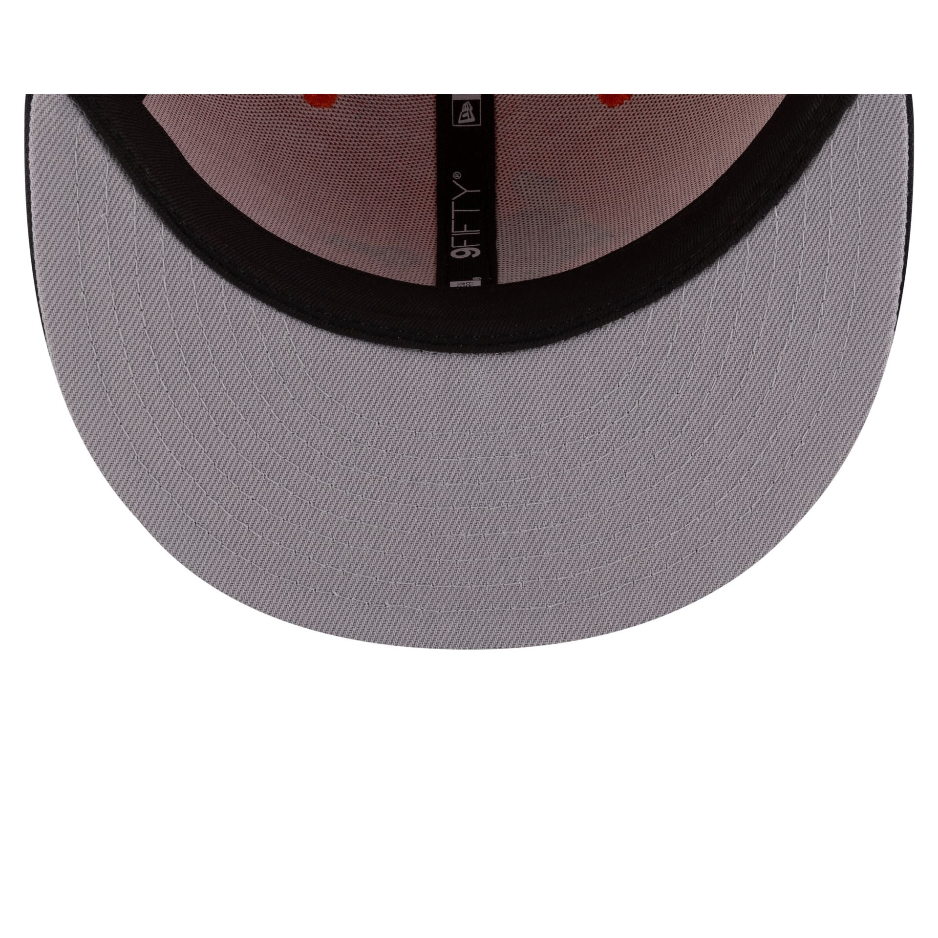 The Houston Astros Mascot Orange 9FIFTY Snapback features an embroidered Astros mascot at the front panels with a 50th Anniversary patch at the right-wear side. Additional details include a snapback closure at the rear and a gray undervisor.