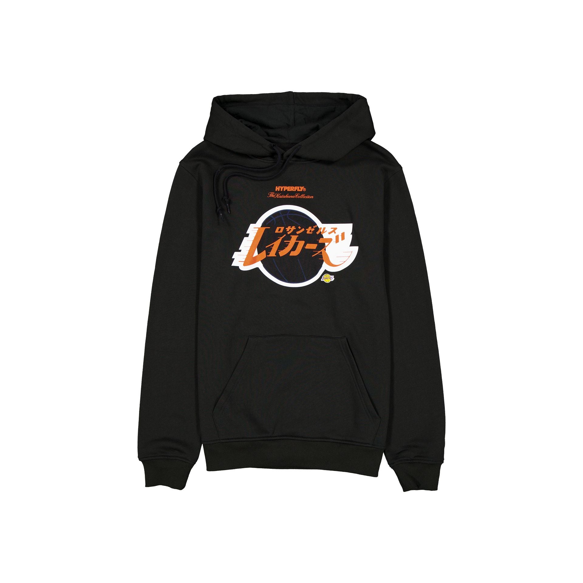 The Los Angeles Lakers 2025 All-Star Game Hoodie features a black and orange screen-printed Katakana-themed Lakers graphic at the front.