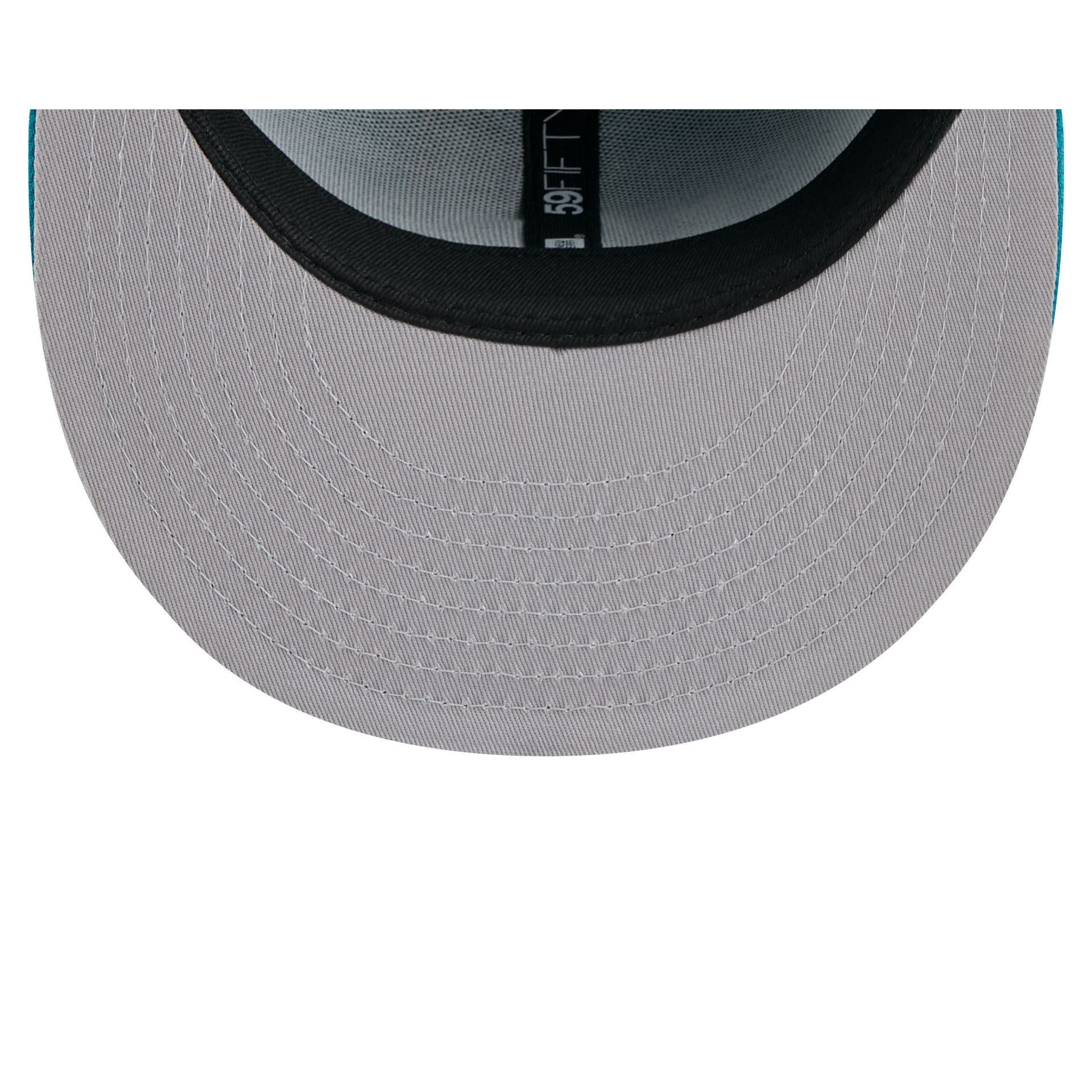 The Jacksonville Jaguars Deceptor 59FIFTY Fitted Cap features an embroidered Jaguars deceptive logo at the front panels with a team logo at the right-wear side. Additional details include a wordmark at the rear. and a gray undervisor.