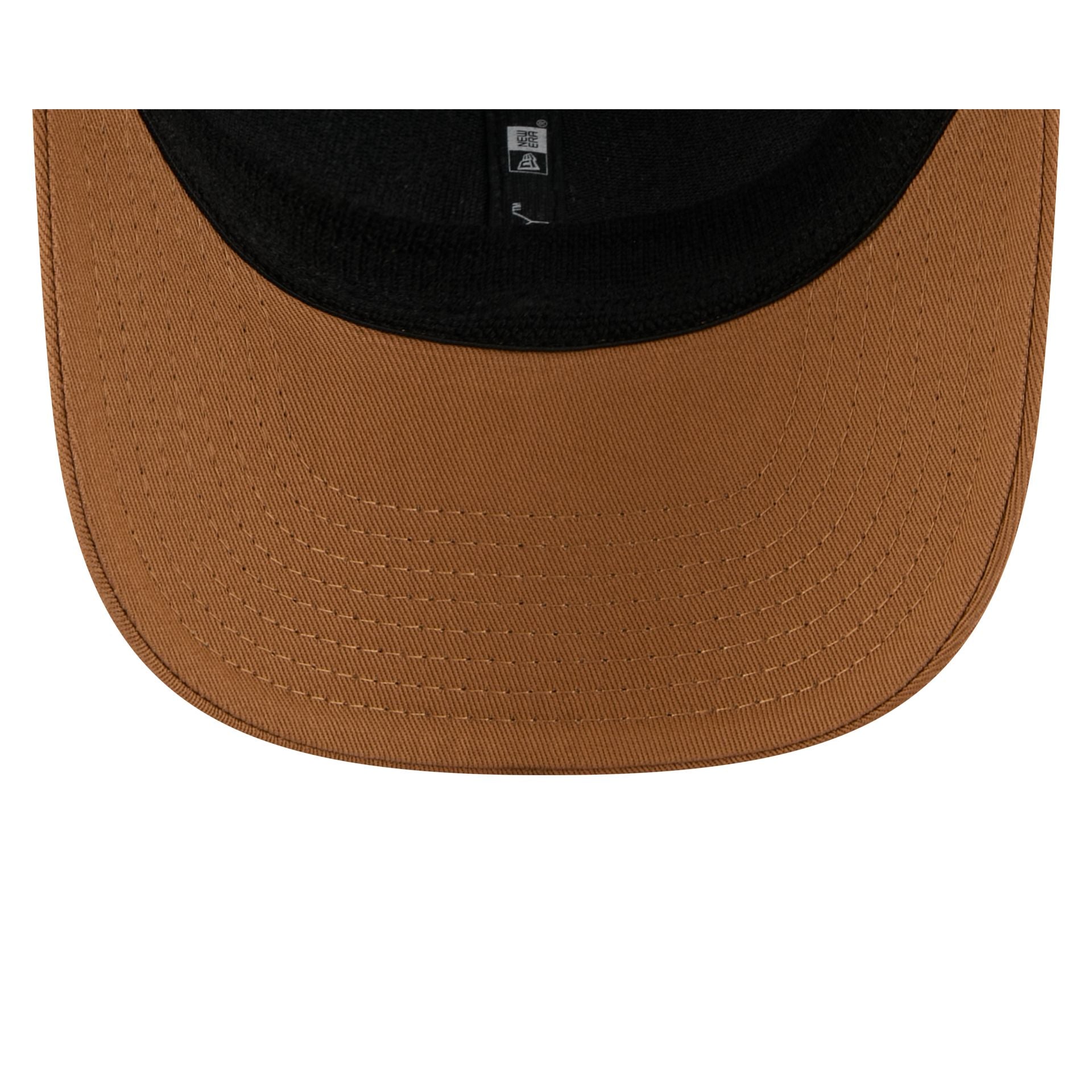 The Las Vegas Raiders Bronze 9SEVENTY Trucker features an embroidered Raiders Historic logo at the front panels with a matching woven team tag at a snapback closure at the rear.