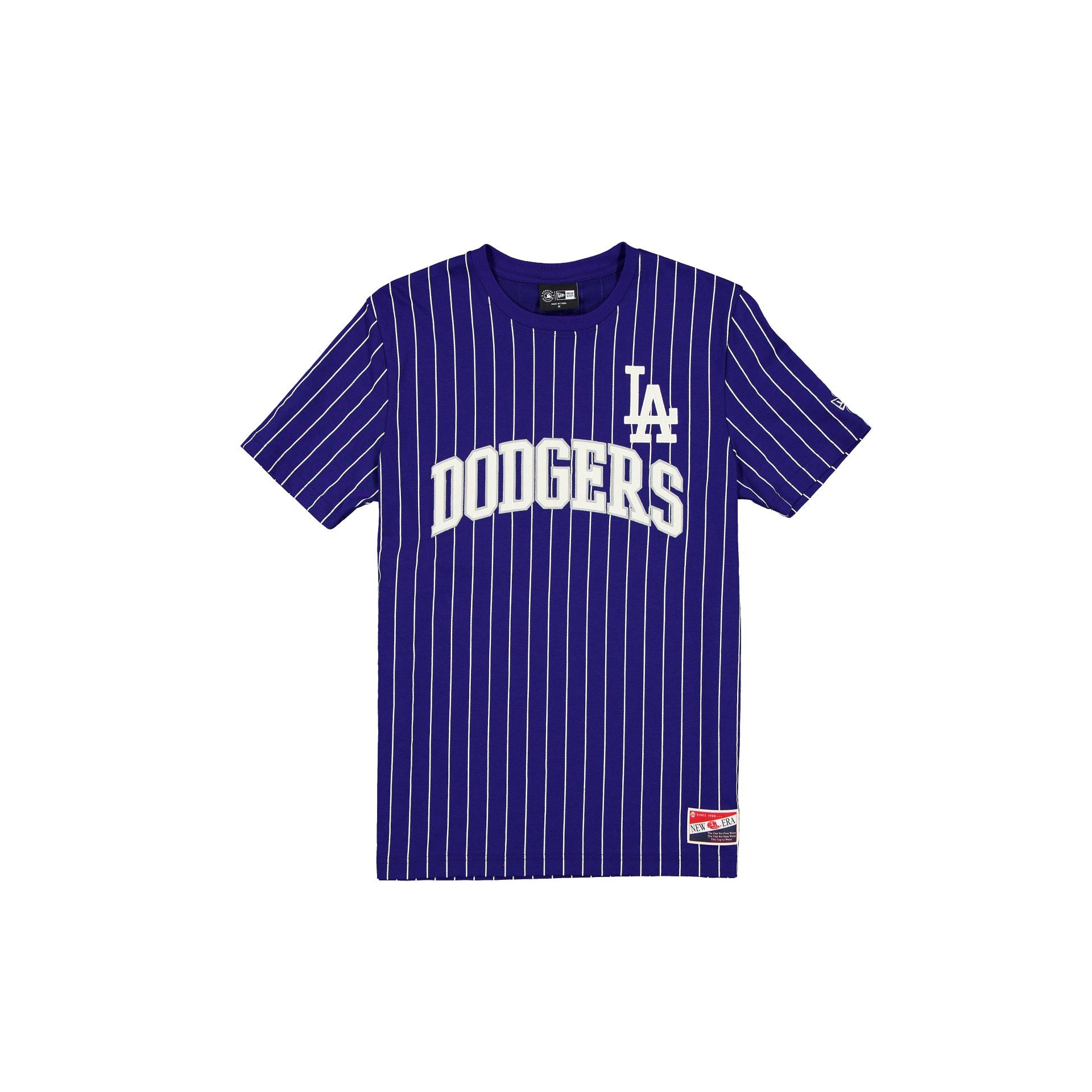 The Los Angeles Dodgers Throwback Pinstripe Wordmark T-Shirt features a twill applique Dodgers wordmark and logo at the front with a New Era jock tag at the left hip.