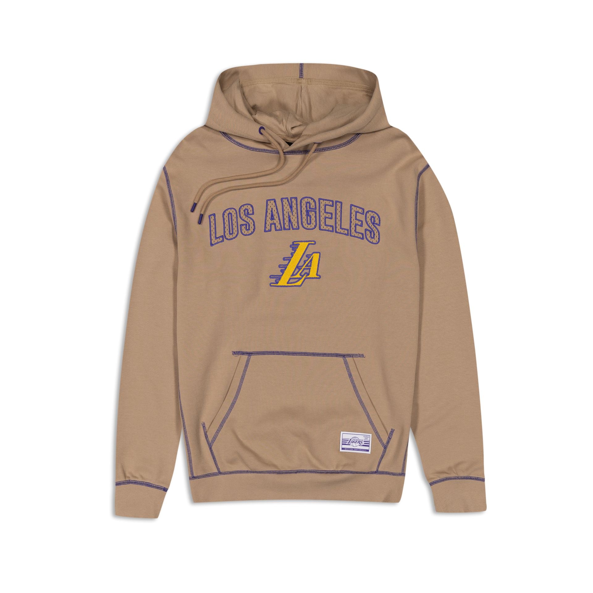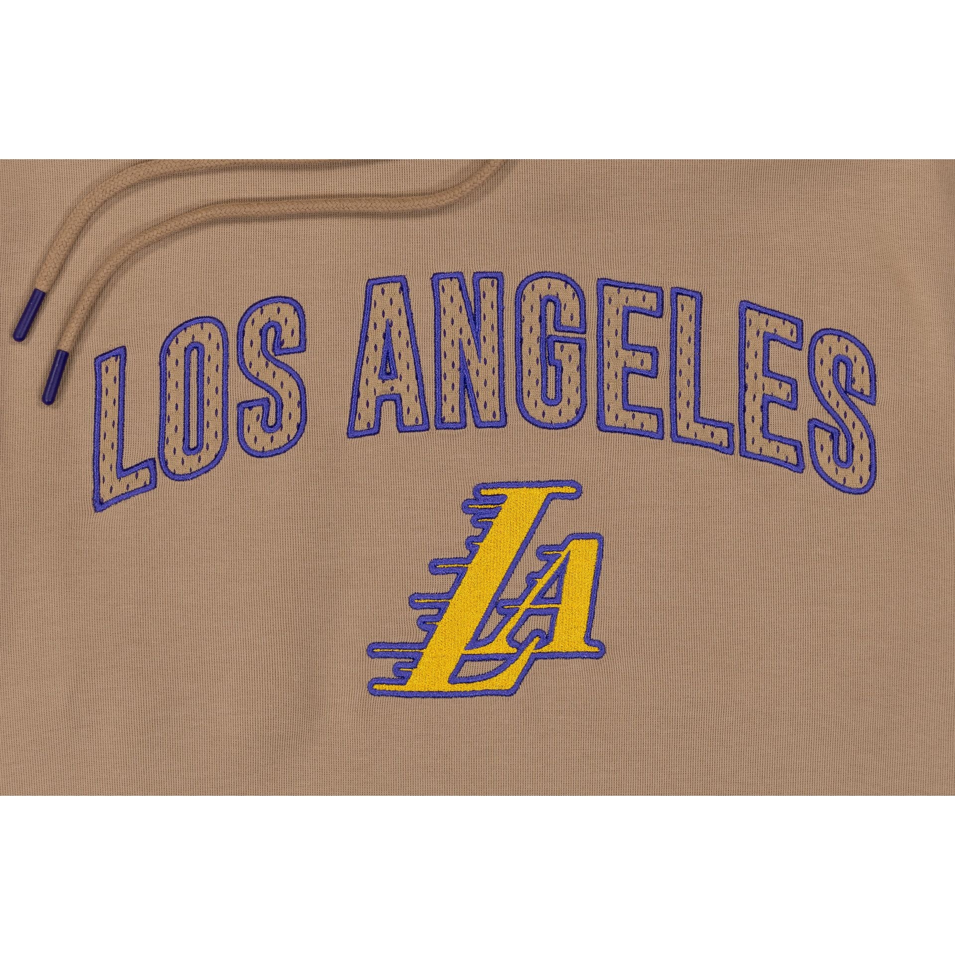 The Los Angeles Lakers 2023 City Edition Tan Hoodie features a mesh applique Lakers wordmark and embroidered team logo at the chest with a team jock tag at the kangaroo pocket.