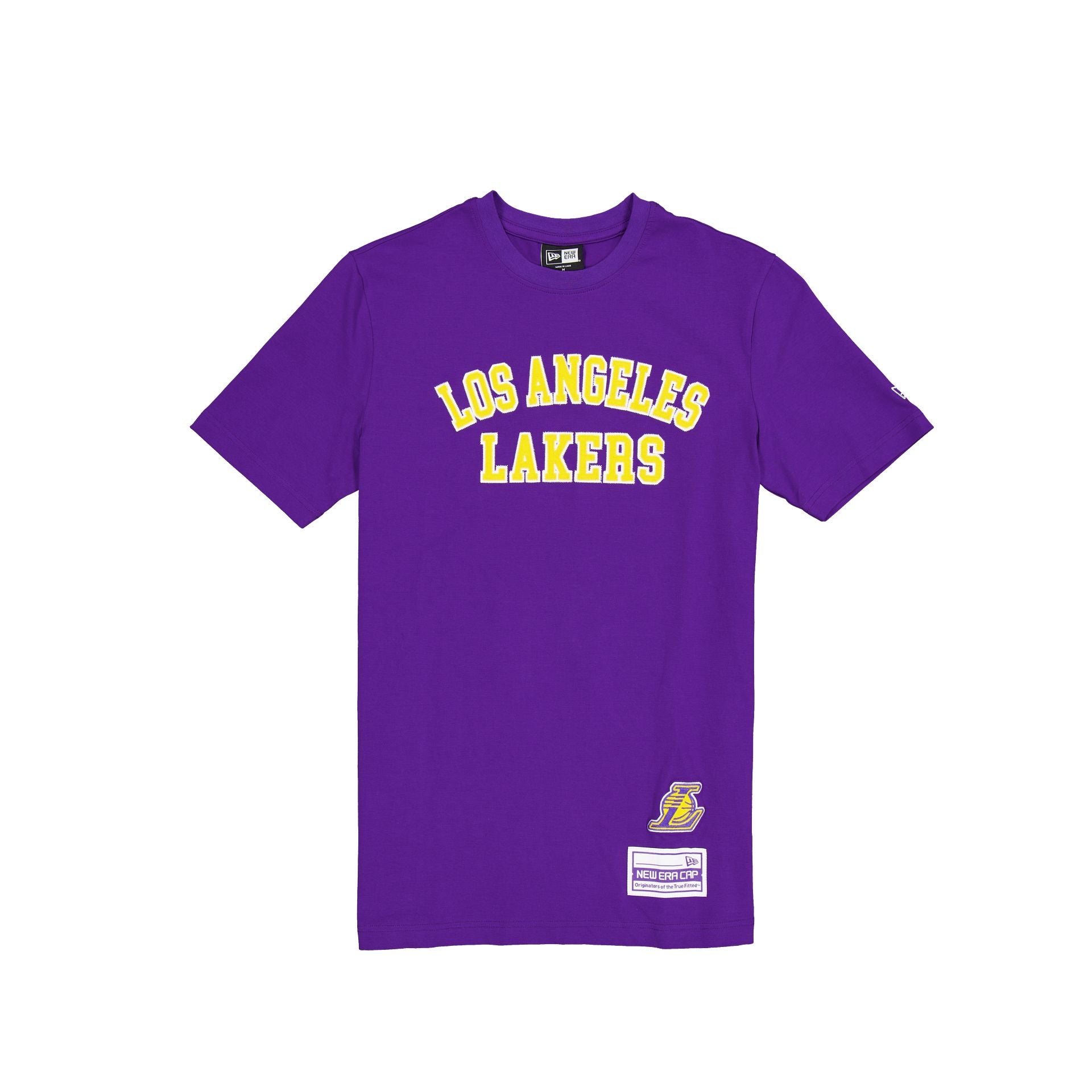 The Los Angeles Lakers Team Color Logo Select T-Shirt features a zig zag stitched twill applique Lakers wordmark at the chest with an embroidered team logo above a New Era Cap jock tag at the left hip.
