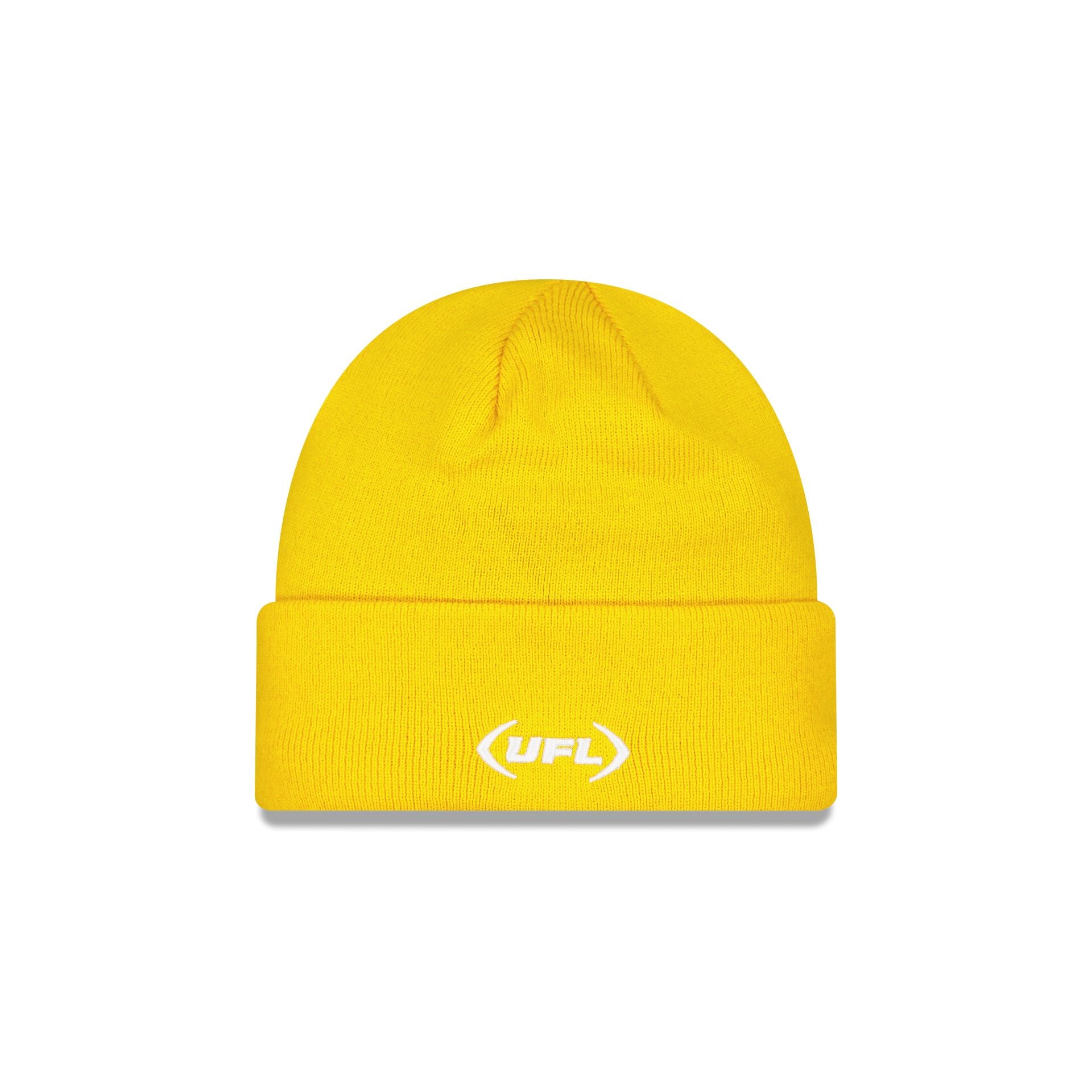 The Memphis Showboats Yellow Cuff Knit Beanie features an embroidered Showboats logo at the front cuff with a UFL logo at the rear.