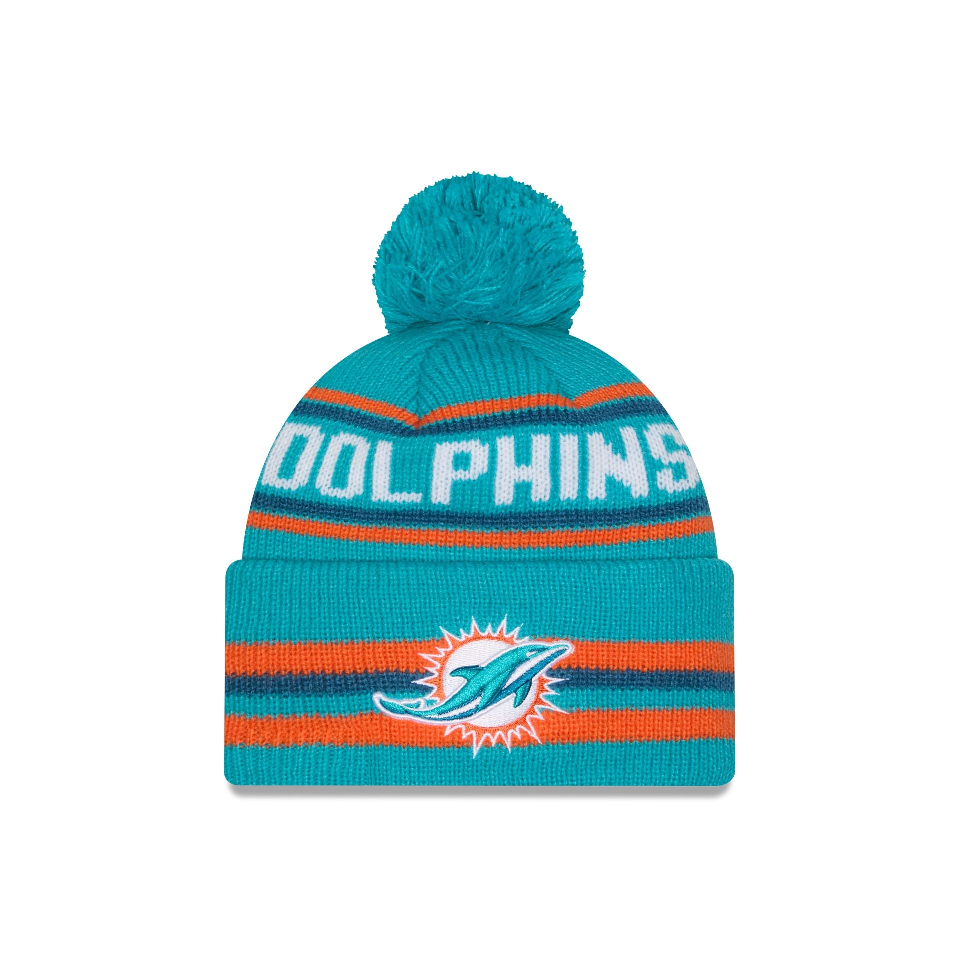 The Miami Dolphins Classic Pom Knit Hat features an embroidered Dolphins logo at the front cuff with a wordmark at the crown and a one-time removable pom.