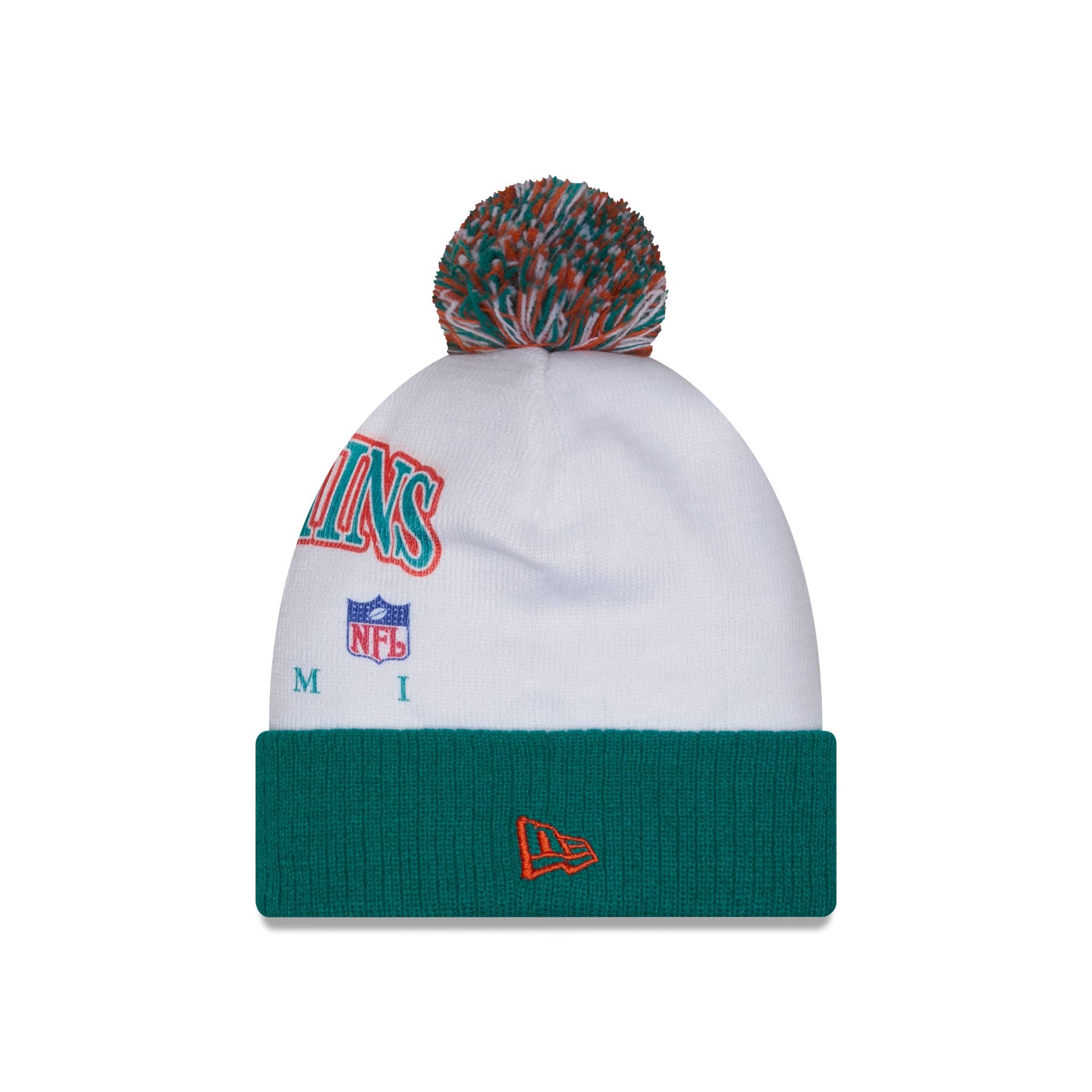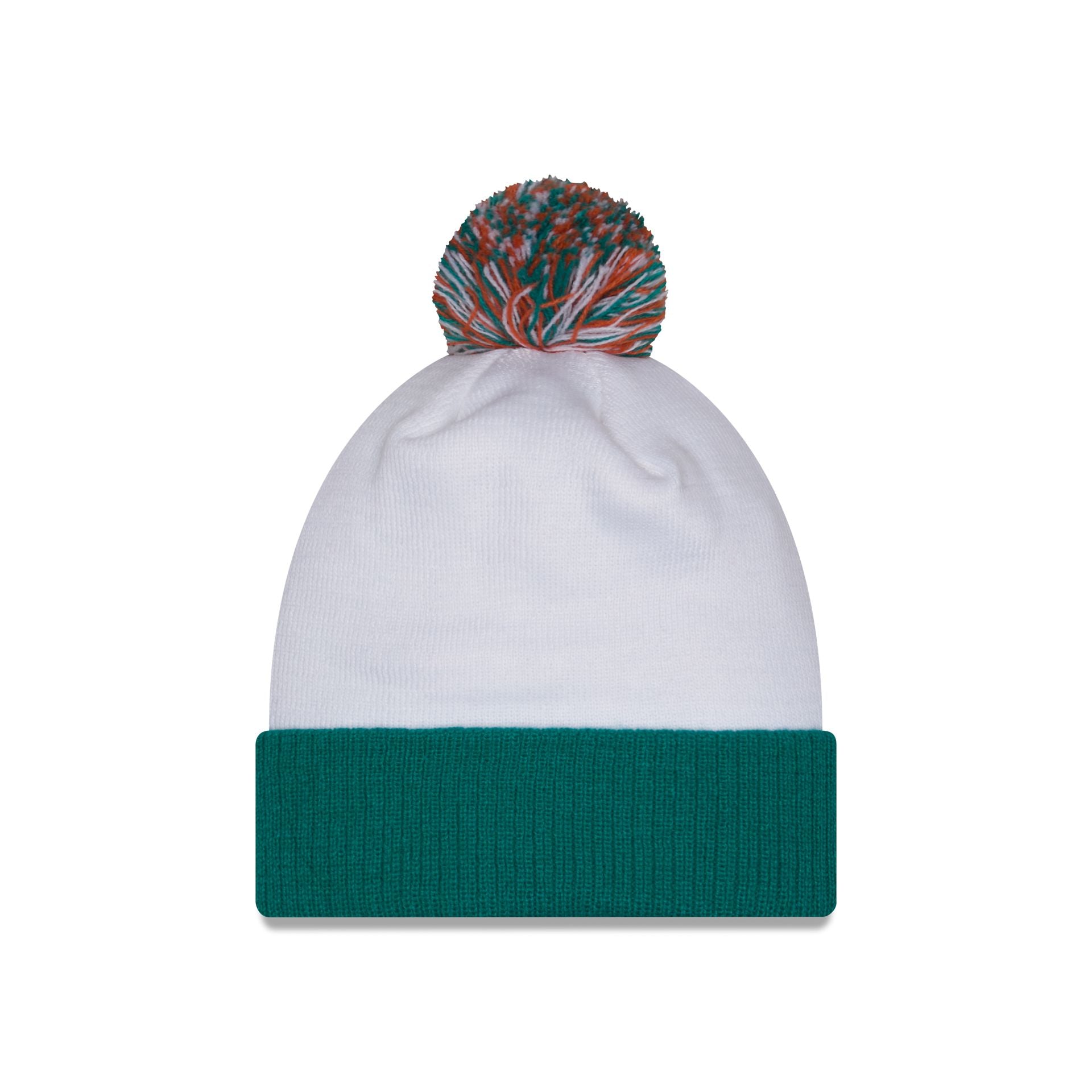 The Miami Dolphins Spirit Pom Knit features a screen-printed Dolphins Historic graphic at the crown with a one-time removable pom.