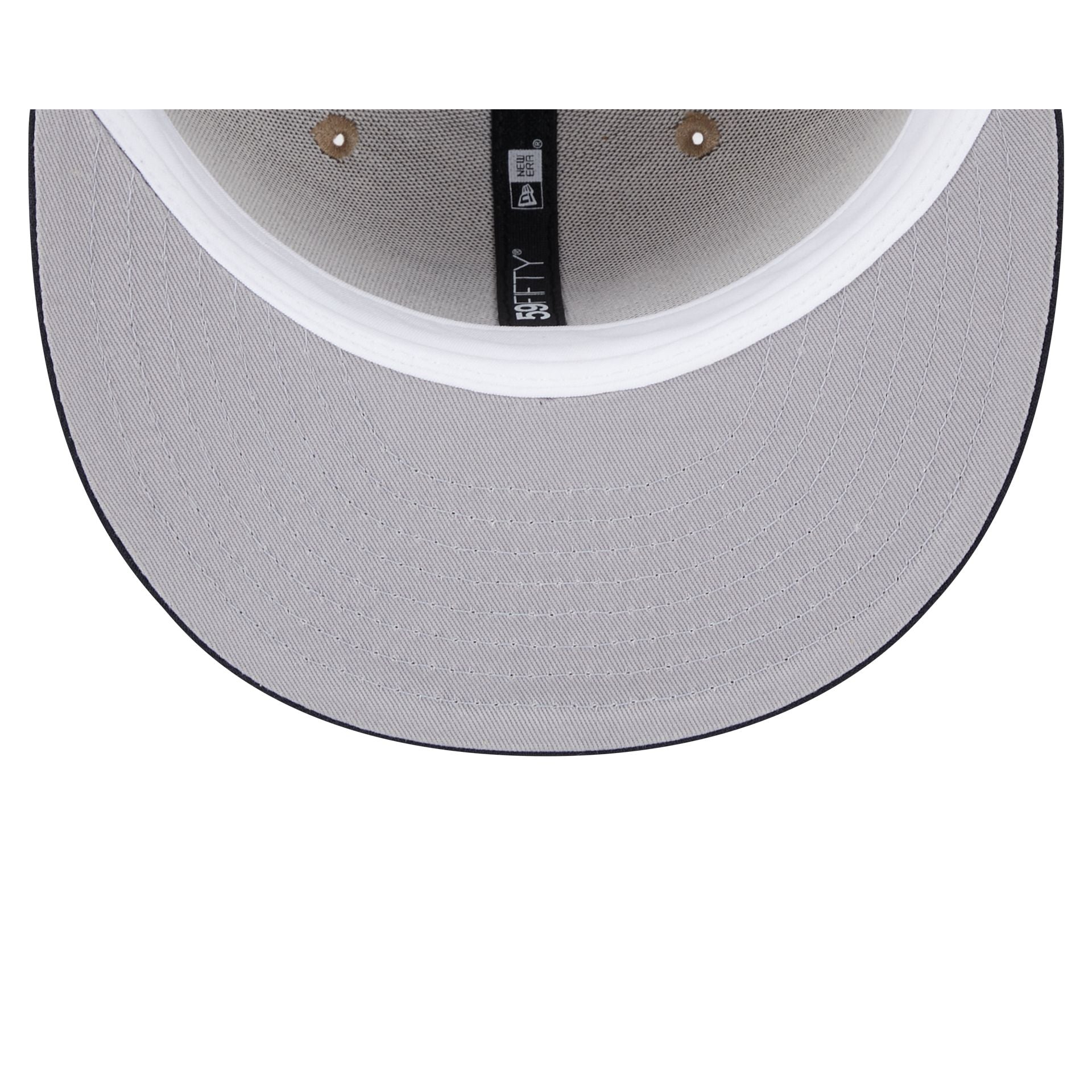 The Michigan Wolverines Camel College Vault 59FIFTY Fitted Cap features an embroidered Wolverines logo at the front panels with a matching team wordmark at the rear and a gray undervisor.