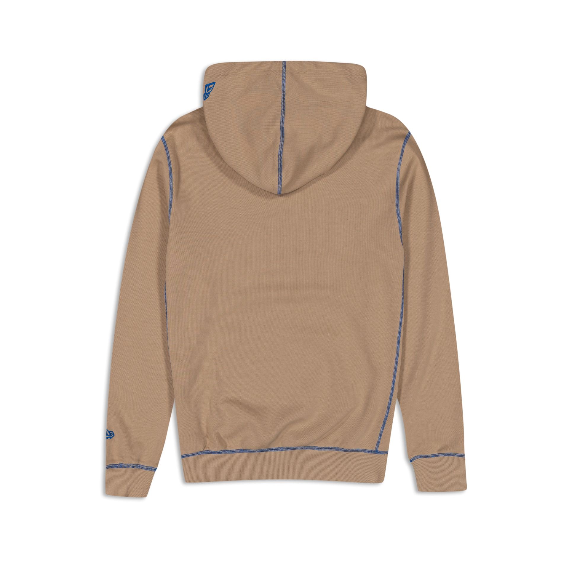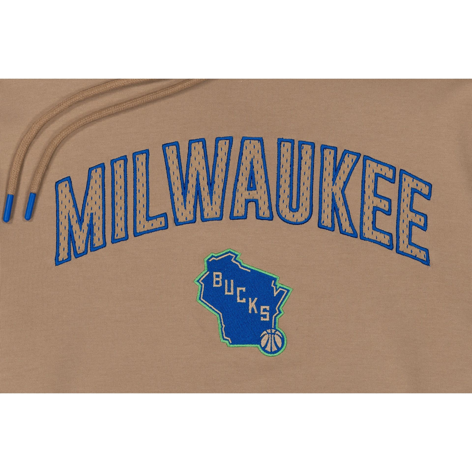 The Milwaukee Bucks 2023 City Edition Tan Hoodie features a mesh applique Bucks wordmark and embroidered team logo at the chest with a team jock tag at the kangaroo pocket.