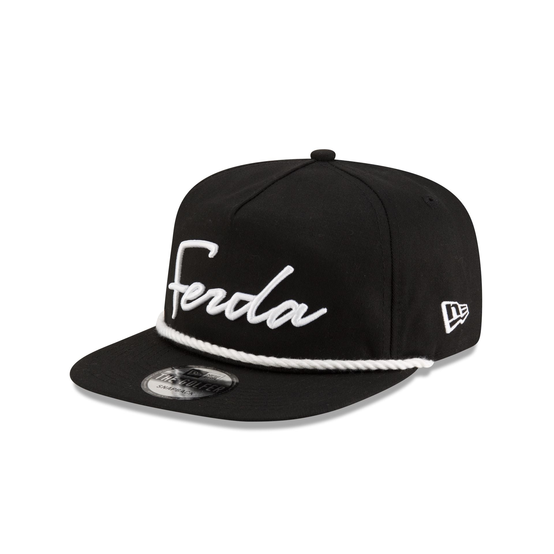 The New Era Cap Ferda Golfer Hat features an embroidered Ferda script at the front panels with a Buffalo patch at the right-wear side and a blue undervisor.