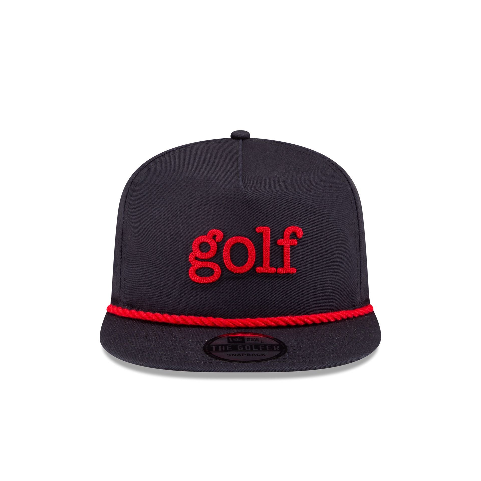 The New Era Golf Navy Golfer features an embroidered golf text at the front panels with a New Era Golf logo above a snapback closure at the rear and a gray undervisor.