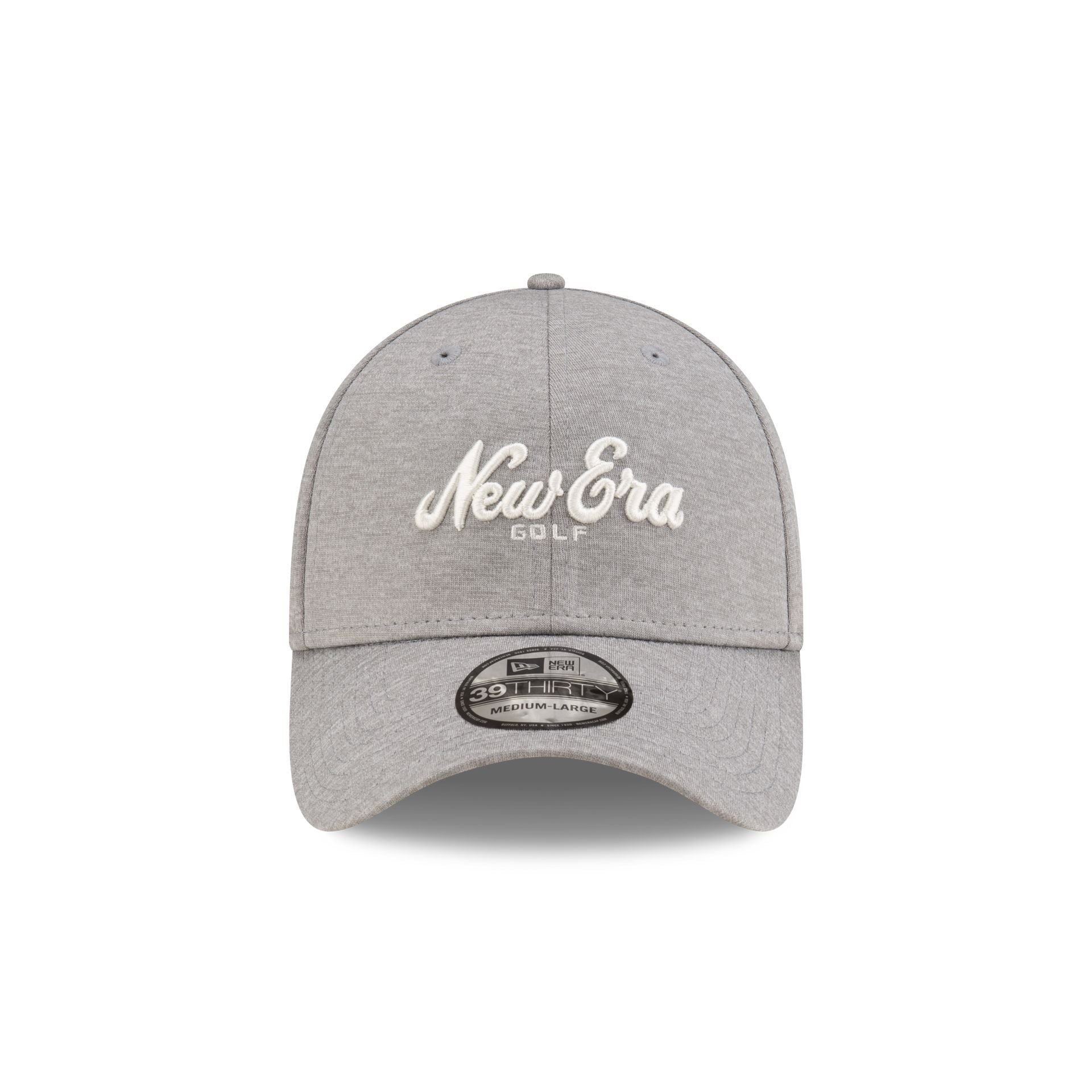 The New Era Golf Script Gray 39THIRTY Stretch Fit Cap features an embroidered New Era Golf wordmark at the front panels with a New Era Golf logo at the rear and a peach undervisor.