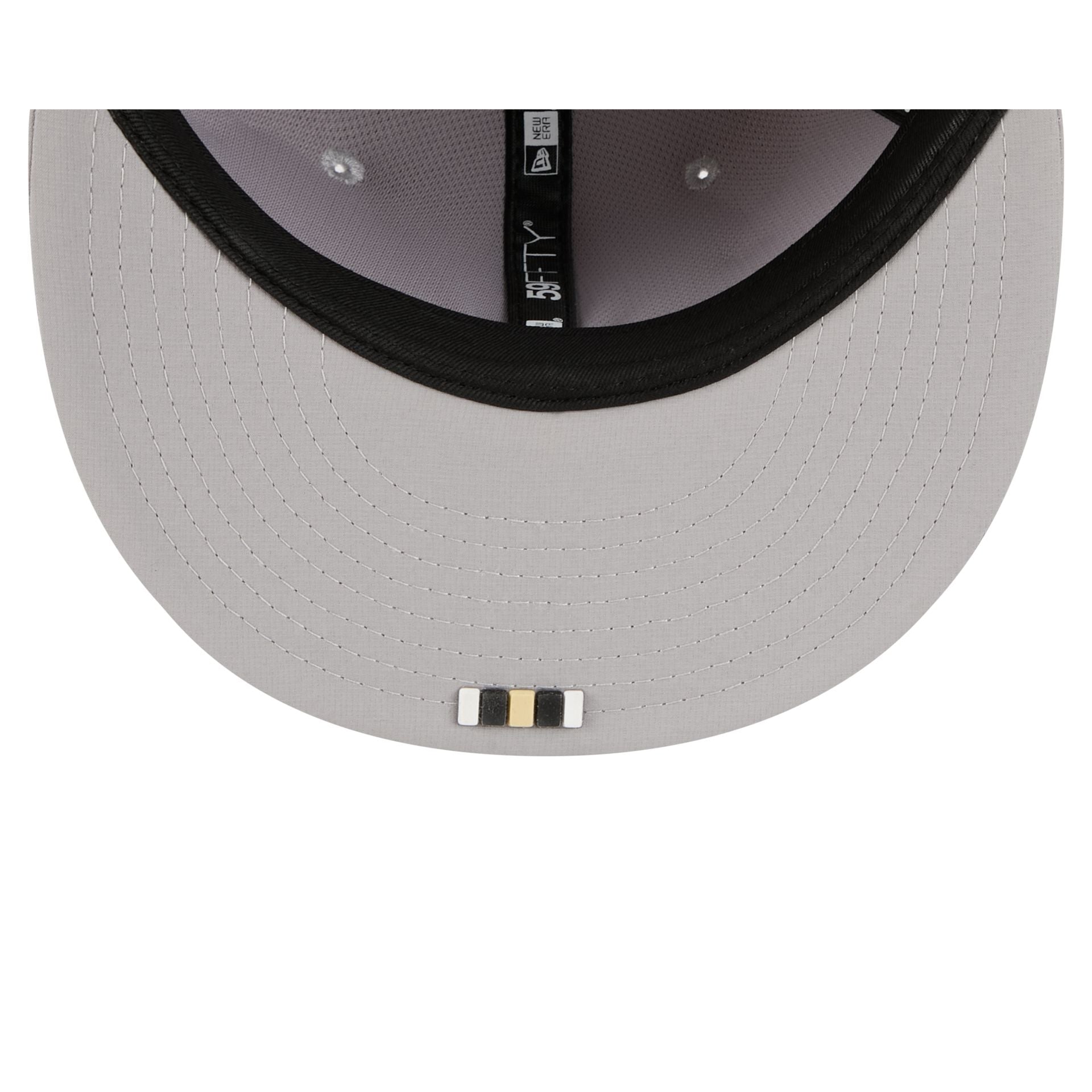 The New Orleans Saints 2025 Sideline Hot Weather Gray 59FIFTY Fitted Cap features a sewn-down silicone Saints logo patch at the front panels with a matching Official NFL Shield logo at the rear. The cap has a water-repellent quill tech fabrication throughout. with a quick-dry cushioned sweatband to absorb moisture. The undervisor is accented with a silicone transfer in the team’s colors.