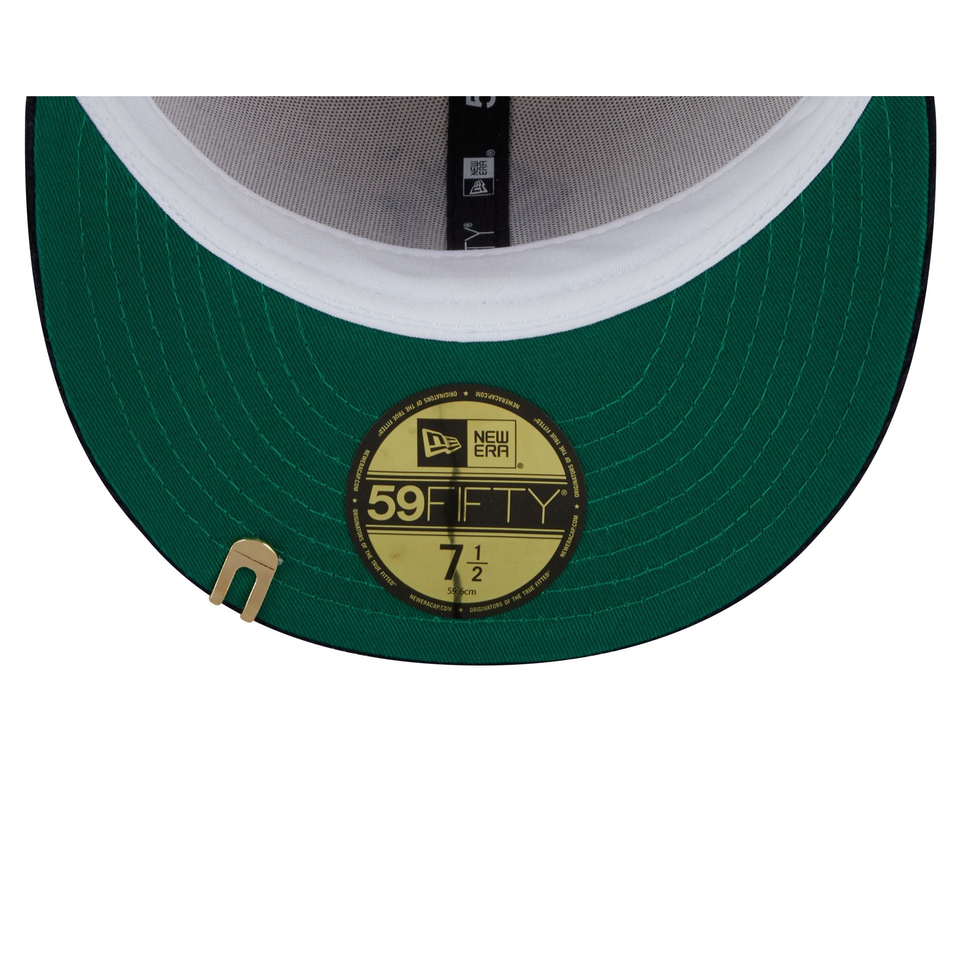 The New York Yankees Two Tone Cord 59FIFTY Fitted Cap features an embroidered Yankees logo at the front panels against a corduroy fabrication throughout with an MLB Batterman logo at the rear. Additional details include a League patch at the right-wear side. a 2009 World Series visor clip. and a green undervisor.