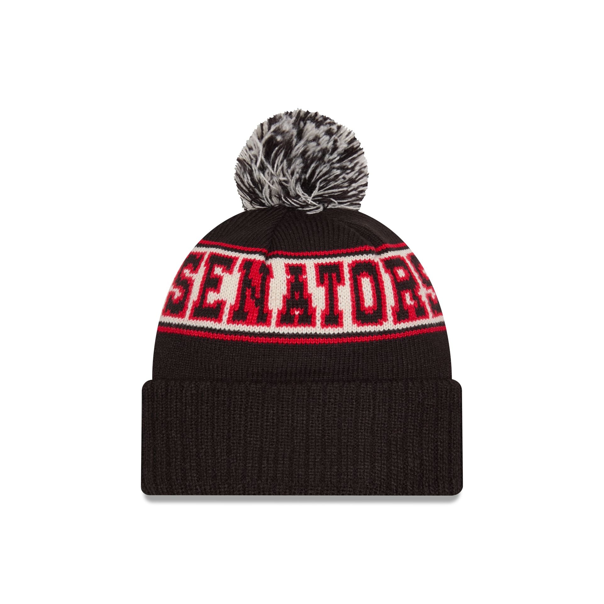 The Ottawa Senators Retro Pom Knit Hat features an embroidered Senators logo at the front cuff with a team wordmark at the crown and a one-time removable pom.