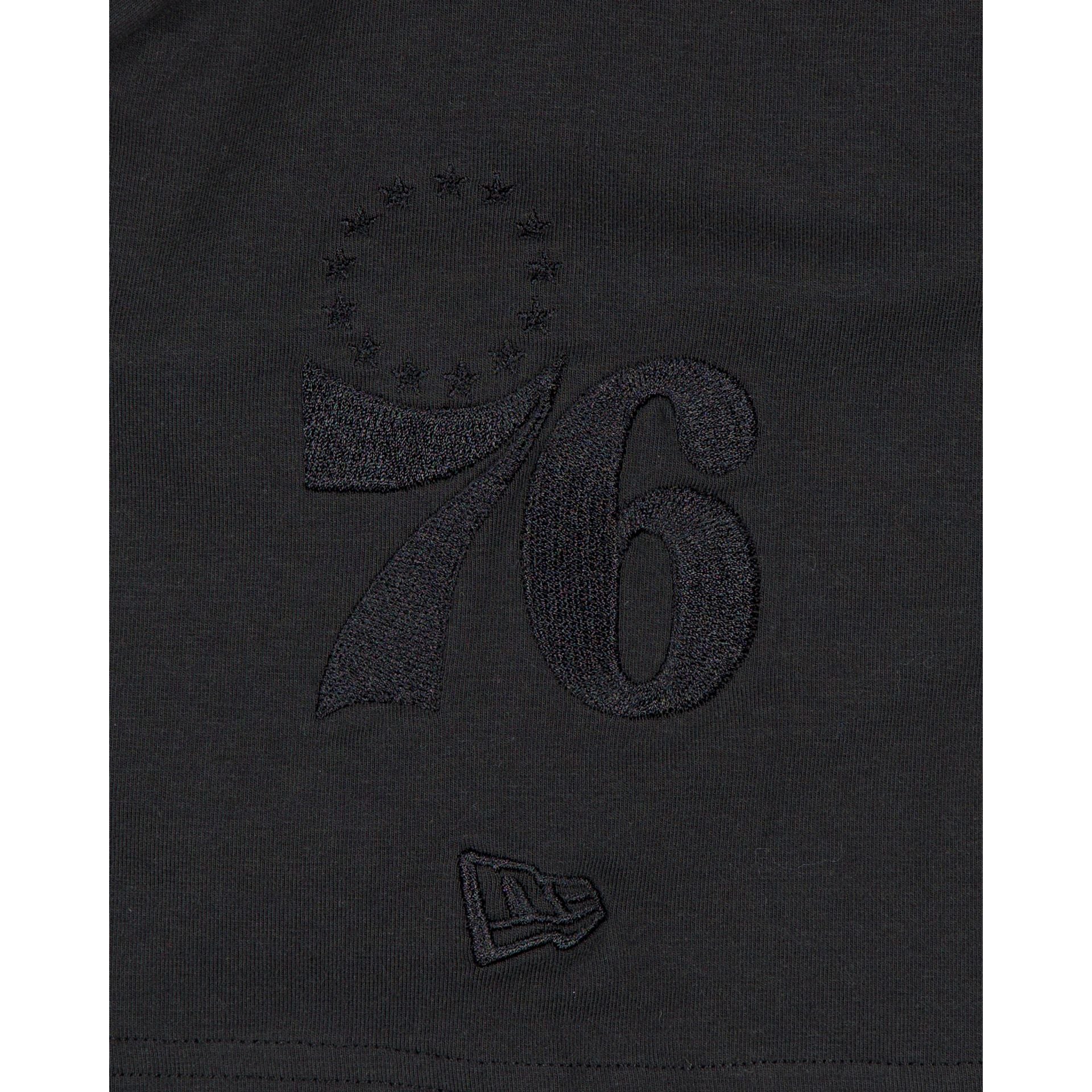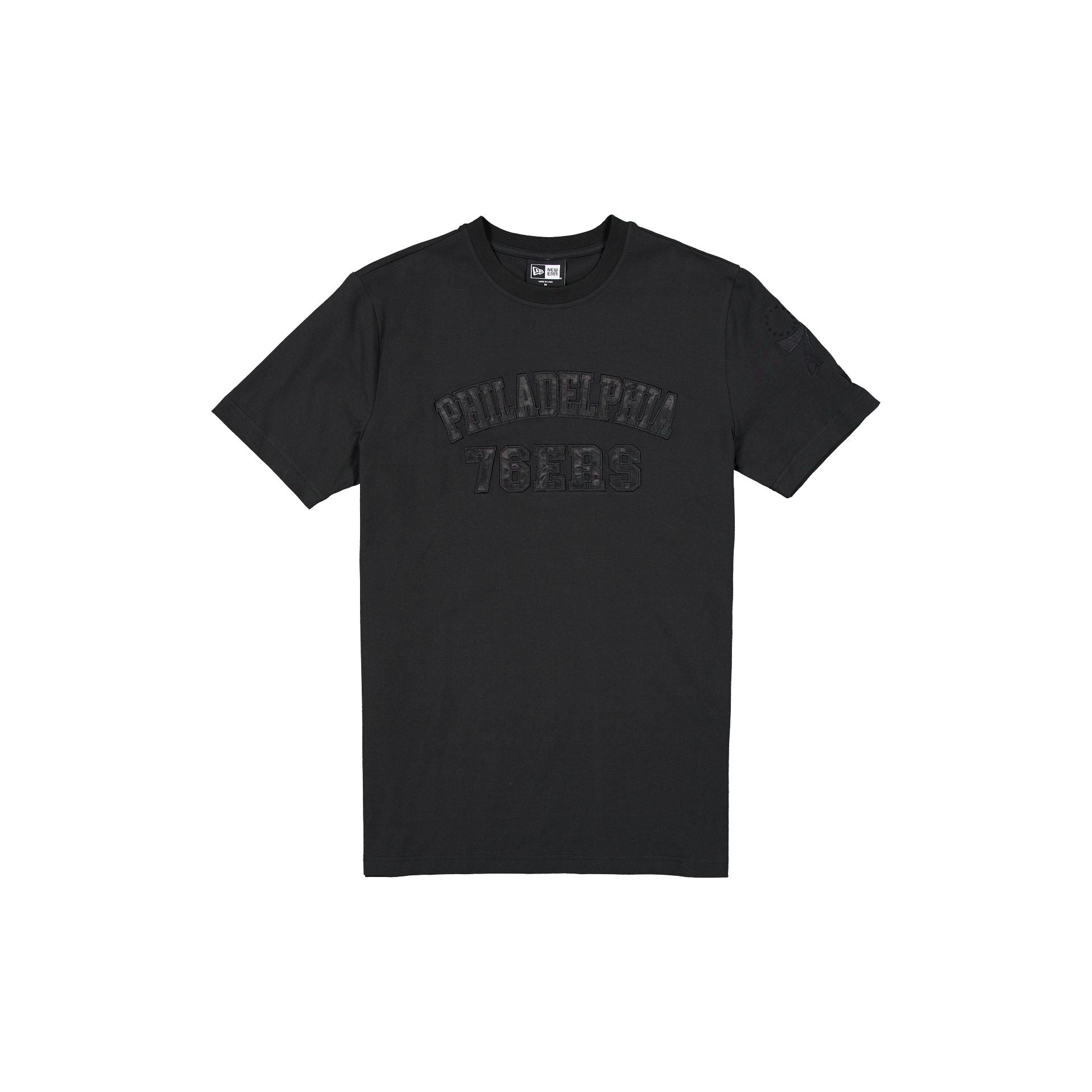 The Philadelphia 76ers Black on Black Logo Select T-Shirt features a satin applique with a tonal stitch 76ers wordmark at the chest and an embroidered team logo at the left-wear sleeve.