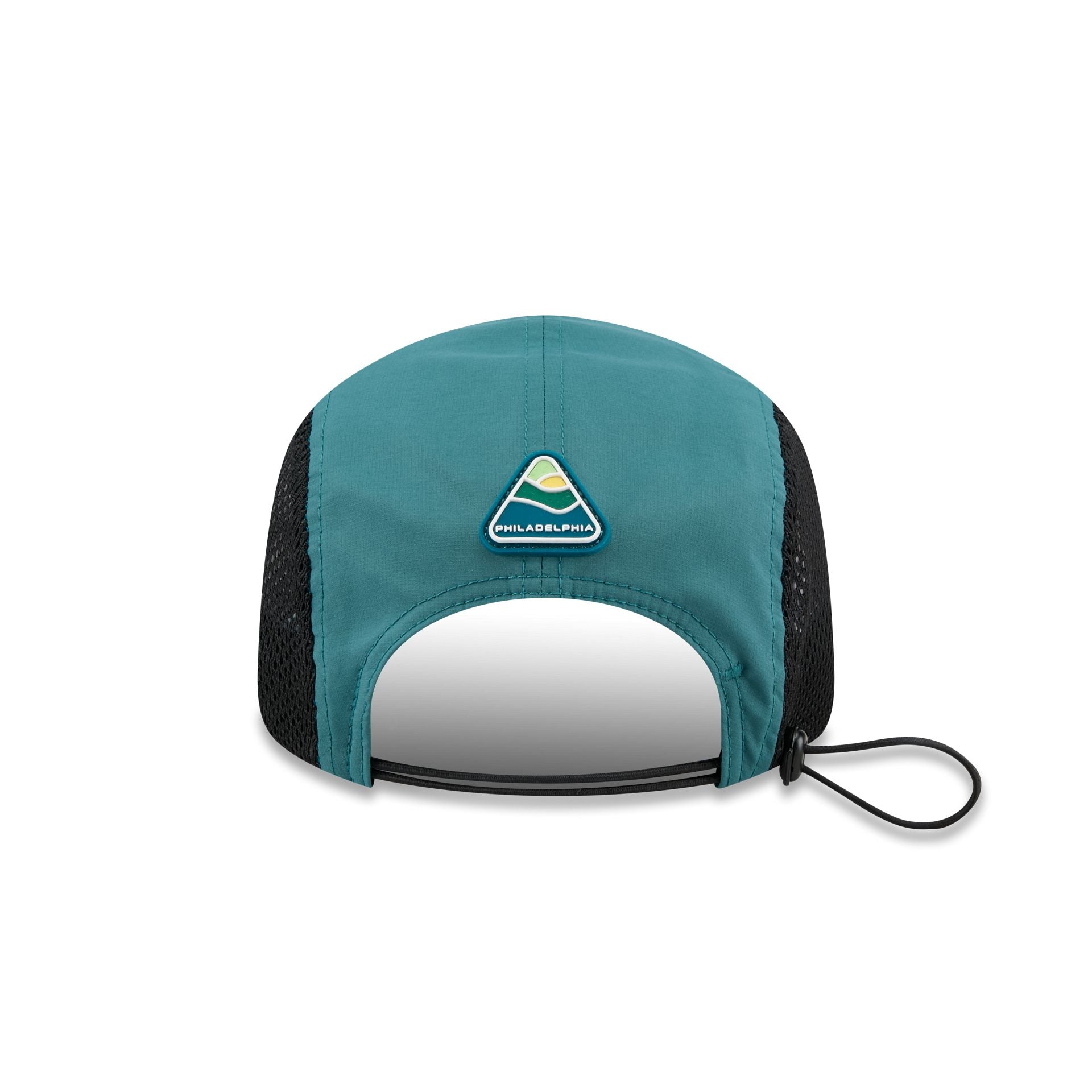 The Philadelphia Eagles Poly Runner Cap features a heat sealed Eagles logo at the front panels with mesh side panels. Additional details include a silicone patch above an adjustable drawstring closure at the rear.