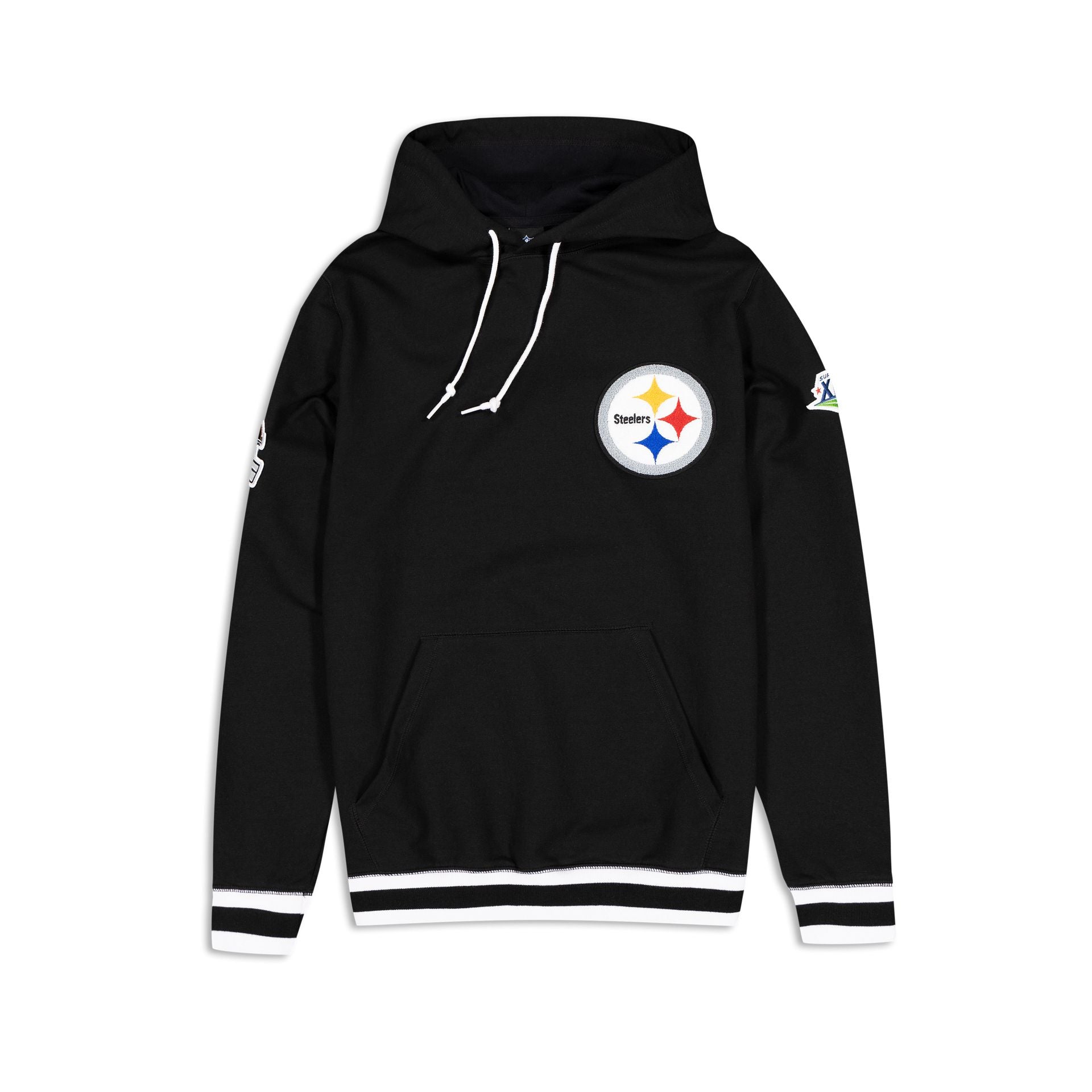 The Pittsburgh Steelers Logo Select Hoodie features a chenille applique Steelers logo at the left chest with team patches at each sleeve and an embroidered team wordmark at the rear.
