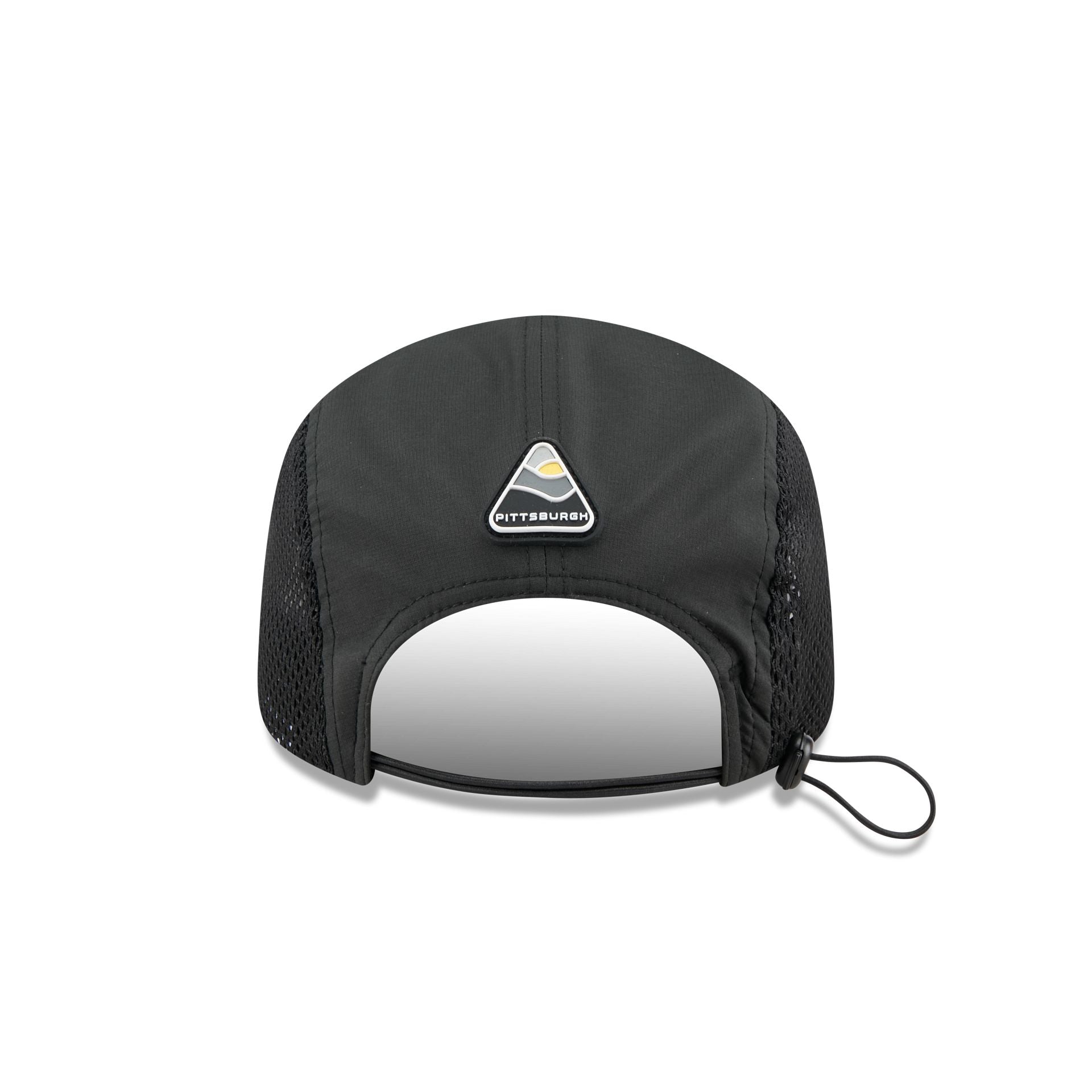 The Pittsburgh Steelers Poly Runner Cap features a heat sealed Steelers logo at the front panels with mesh side panels. Additional details include a silicone patch above an adjustable drawstring closure at the rear.