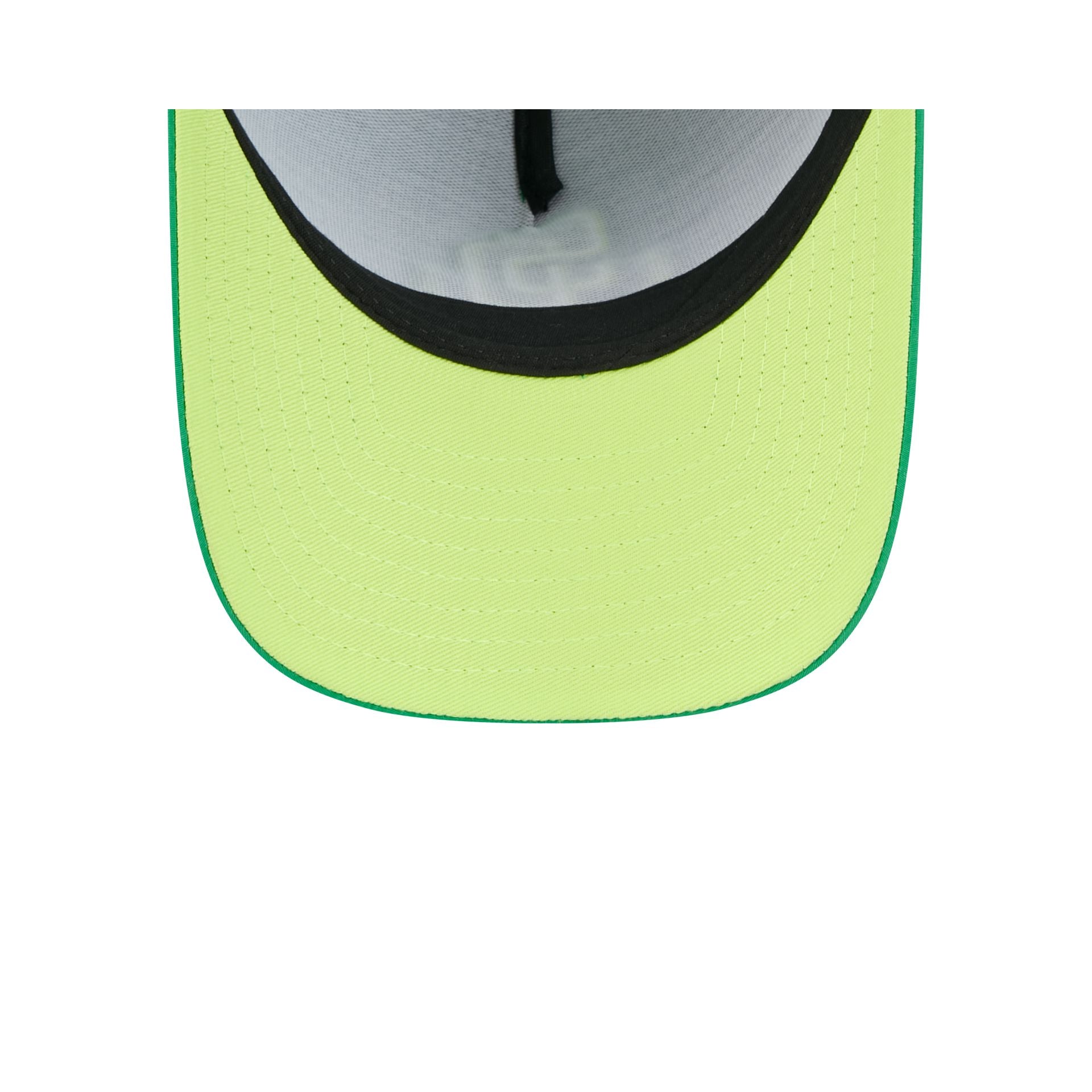 The San Diego Padres Tee Time 9FORTY M-Crown A-Frame Snapback features an embroidered Padres golf logo at the front panels with a snapback closure at the rear and a neon green undervisor.