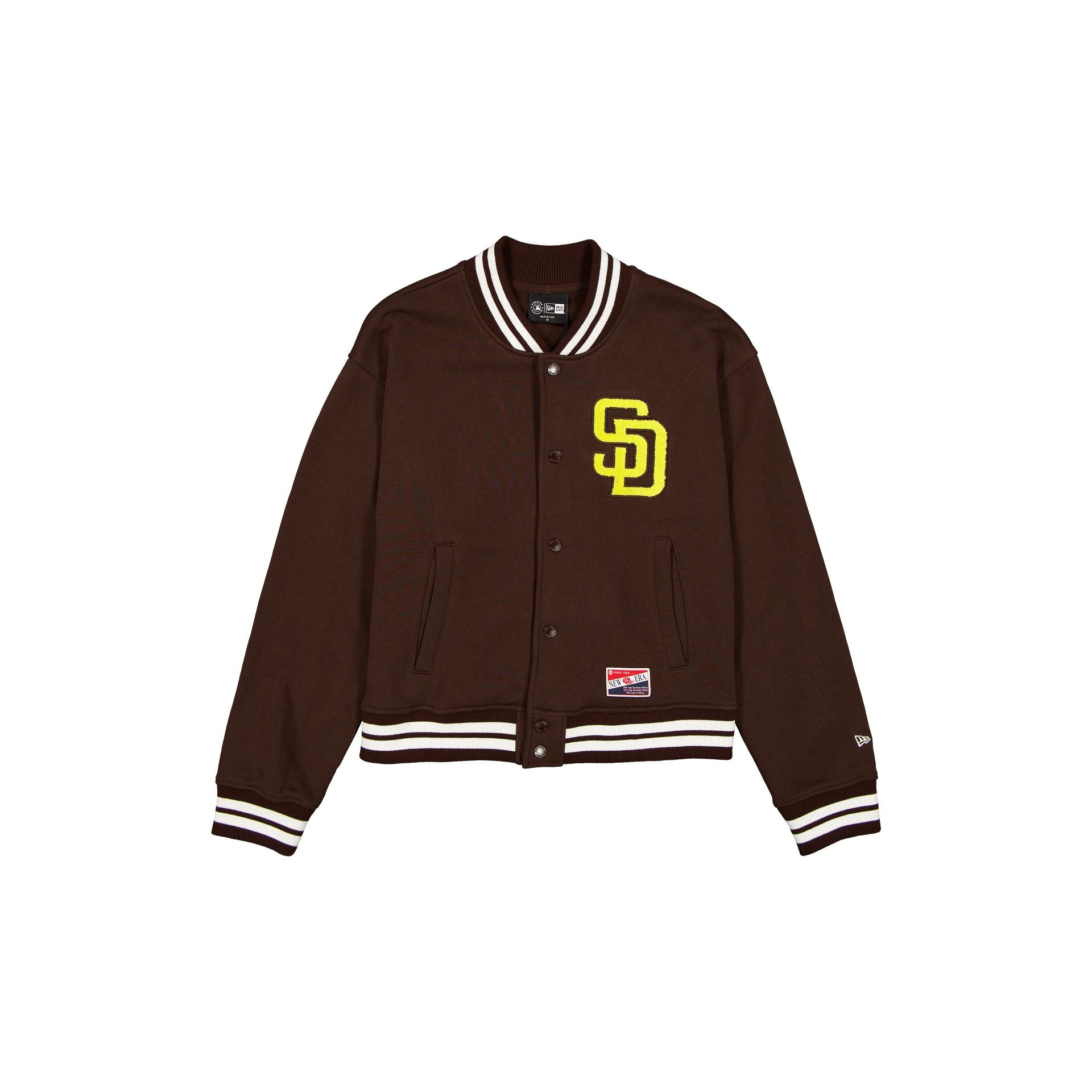 The San Diego Padres Throwback Women’s Snap Front Jacket features a chenille Padres logo at the left chest a snap button closure and front pockets.