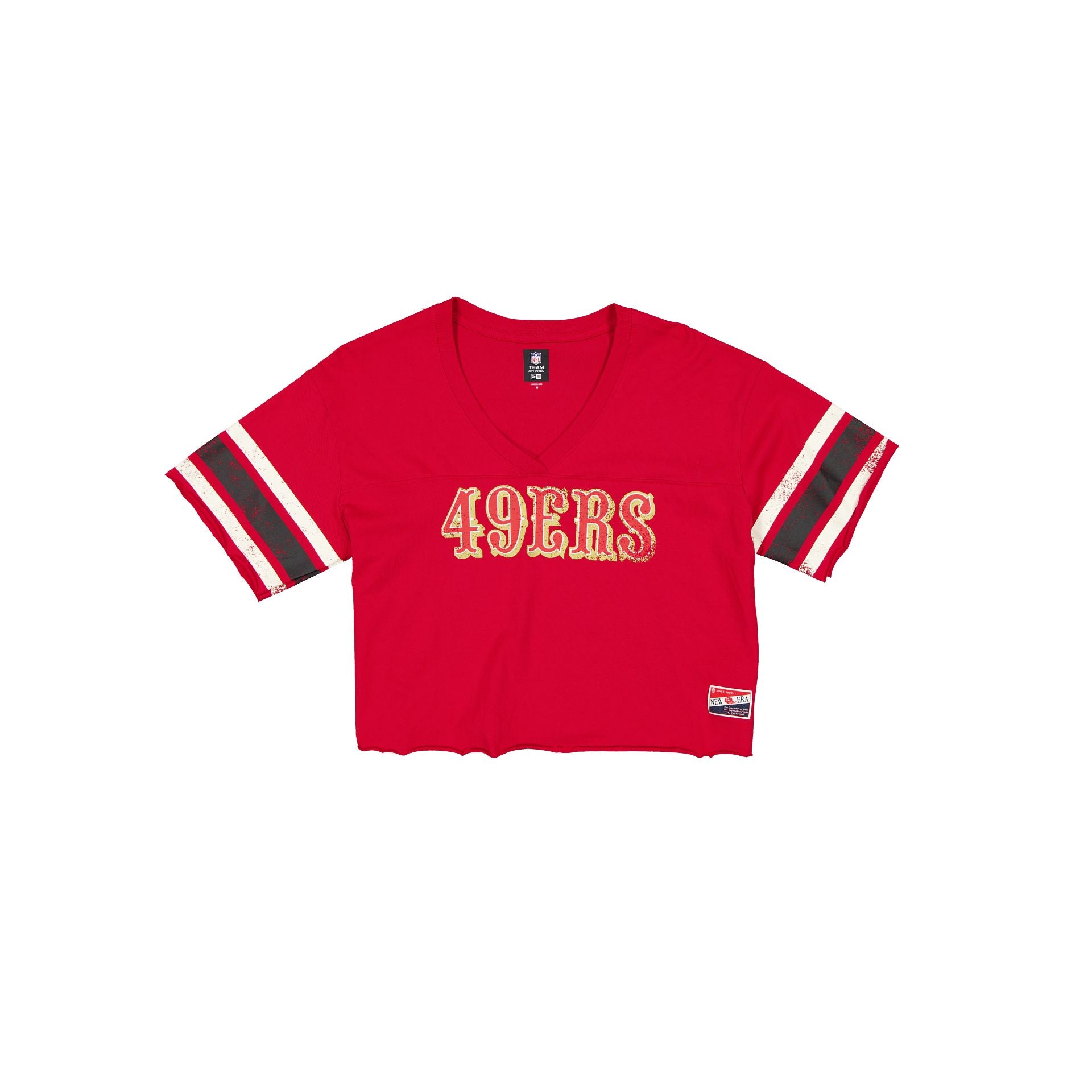 The San Francisco 49ers Throwback Cropped Women’s T-Shirt features a screen-printed 49ers graphic at the front with a New Era jock tag at the left hip. This shirt has a cropped fit.