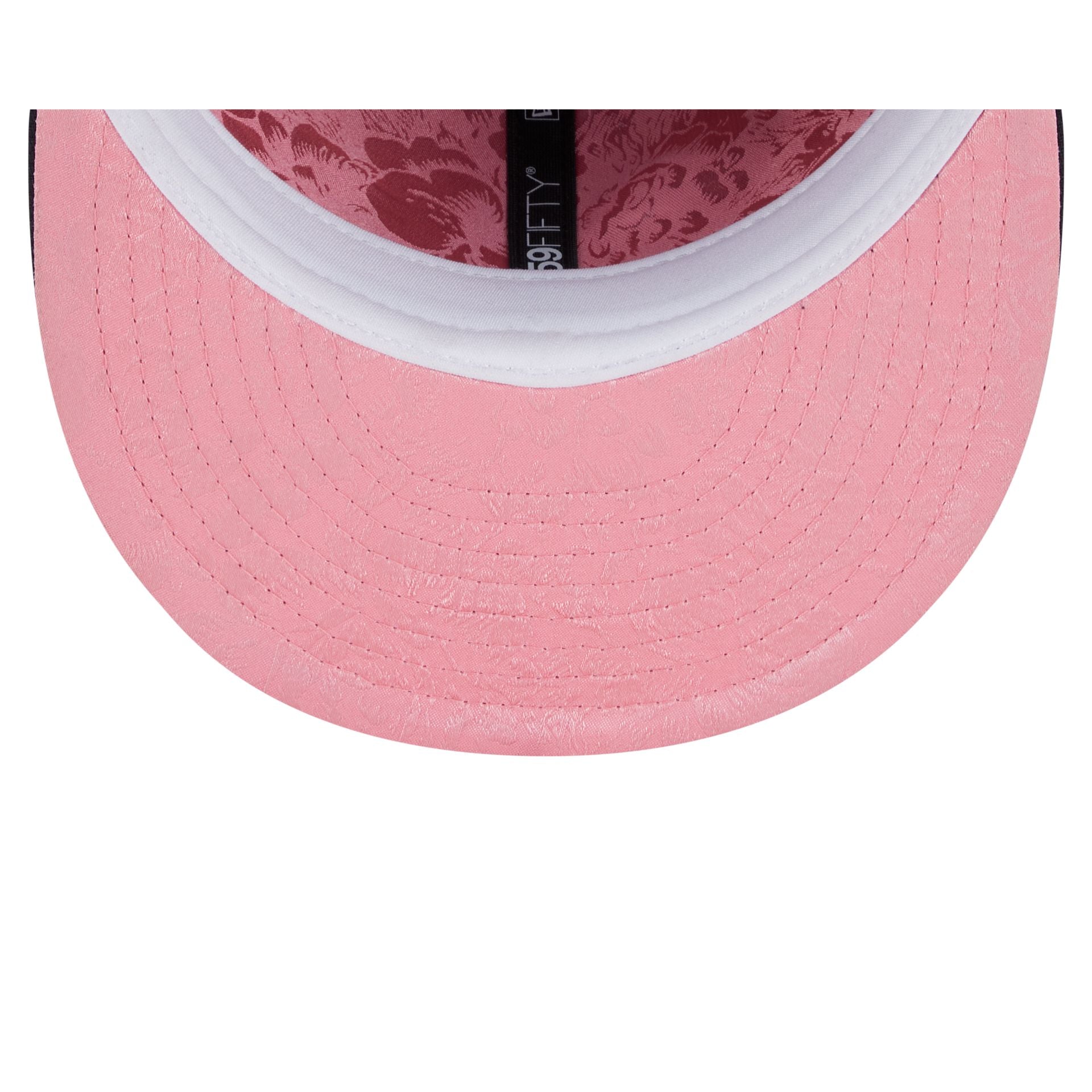 The Seattle Mariners Floral Undervisor 59FIFTY Fitted Cap features an embroidered Mariners logo at the front panels with a matching MLB Batterman logo at the rear. Additional details include a floral team patch at the right-wear side with a pink floral undervisor and lining.