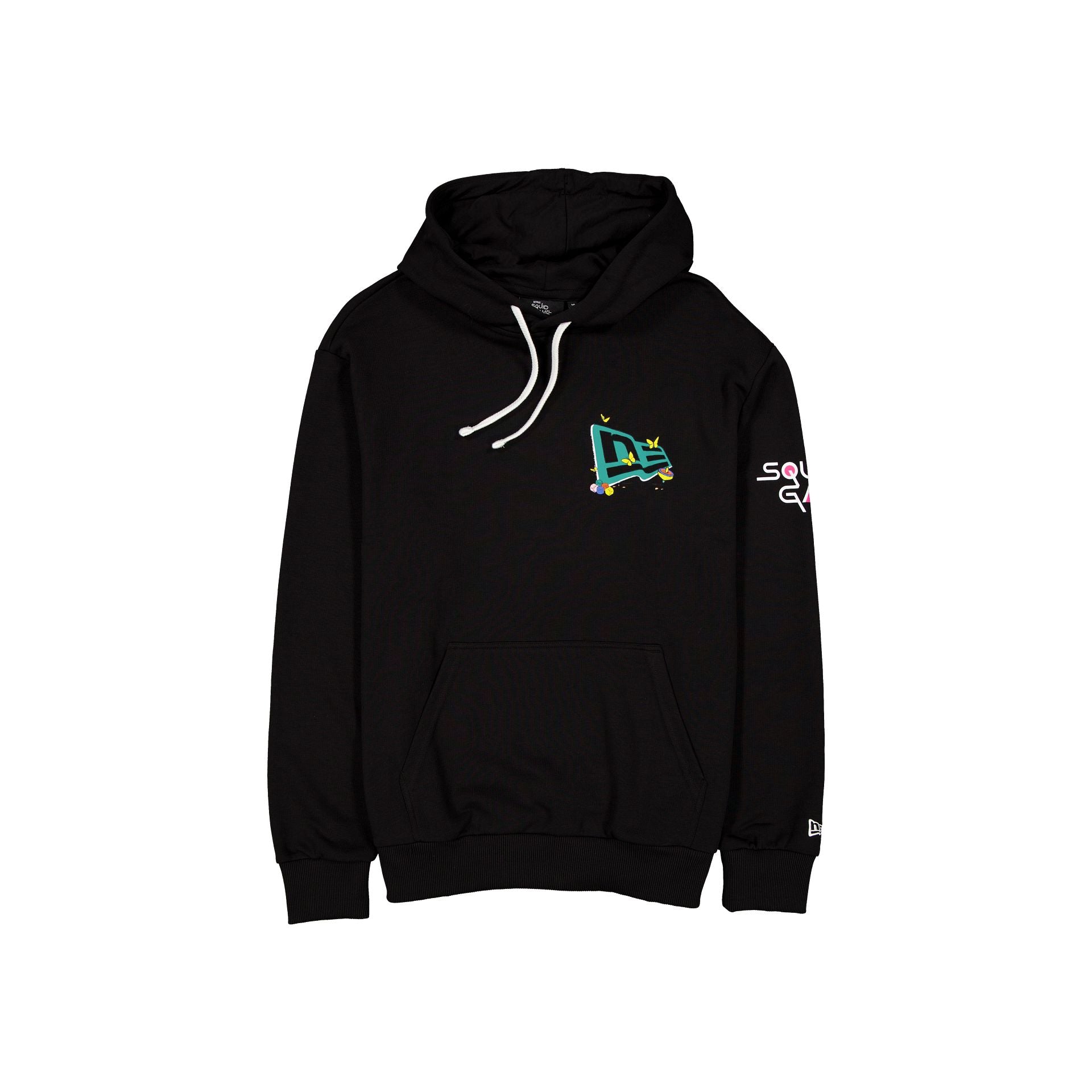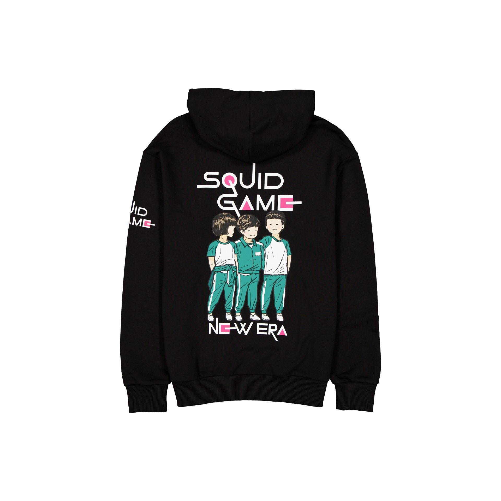 The Squid Game Black Hoodie features a screen-printed Squid Game New Era logo at the left chest and characters at the rear. Additional details include a logo at the left arm. kangaroo pockets. and adjustable drawstrings at the hood.