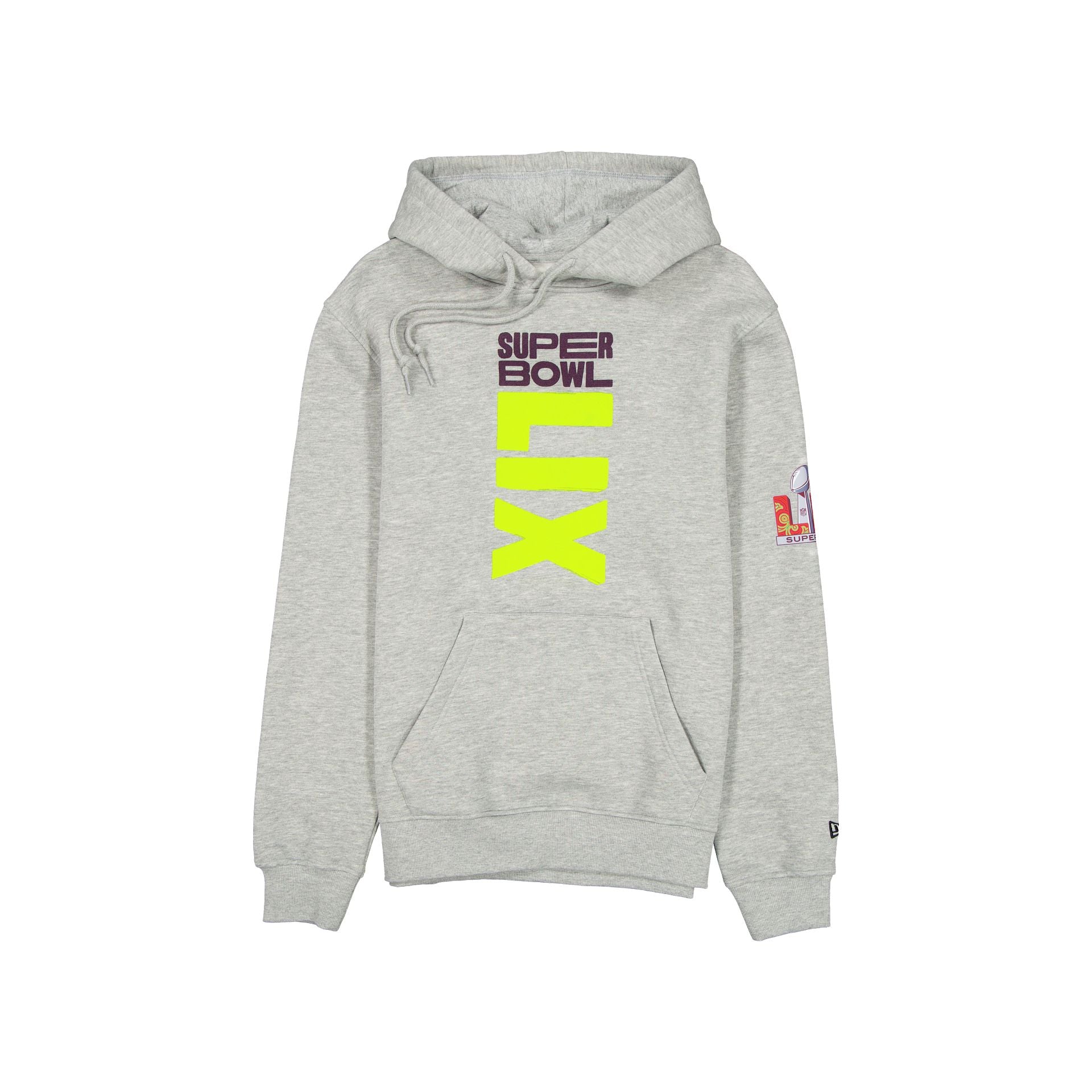 The Super Bowl LIX Gray Hoodie features a screen-printed Super Bowl LIX graphic at the front with a matching logo at the left sleeve. a kangaroo pocket. and adjustable drawstrings at the hood.