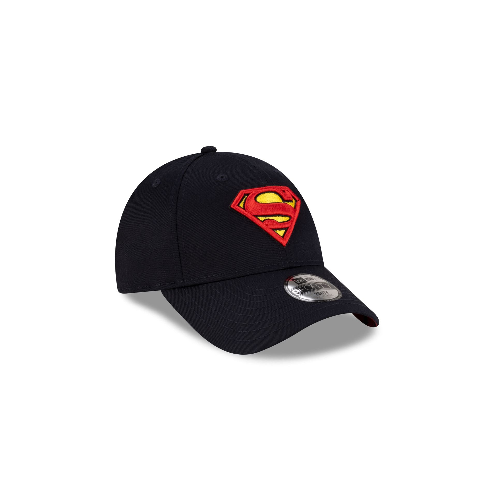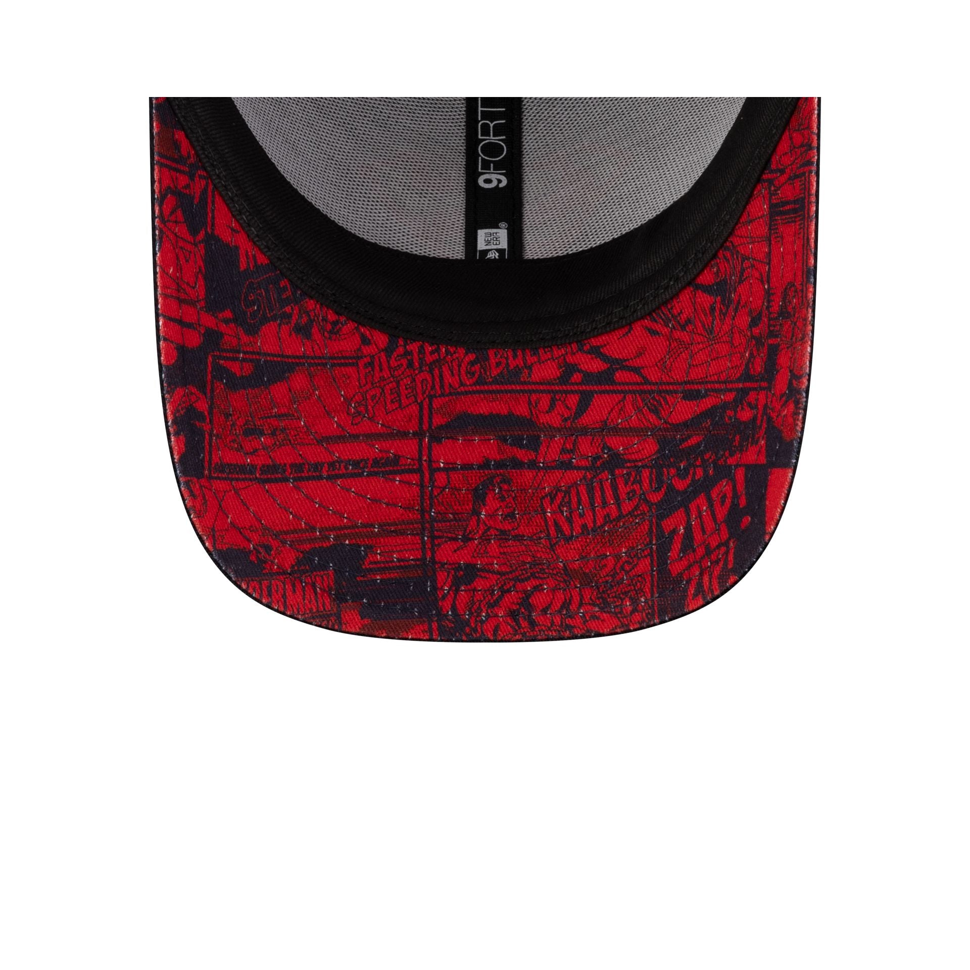 The Superman Navy Kids 9FORTY Adjustable Cap features an embroidered Cap features an embroidered Superman logo at the front panels with a red comic book allover print undervisor and an adjustable D-Ring closure at the rear.