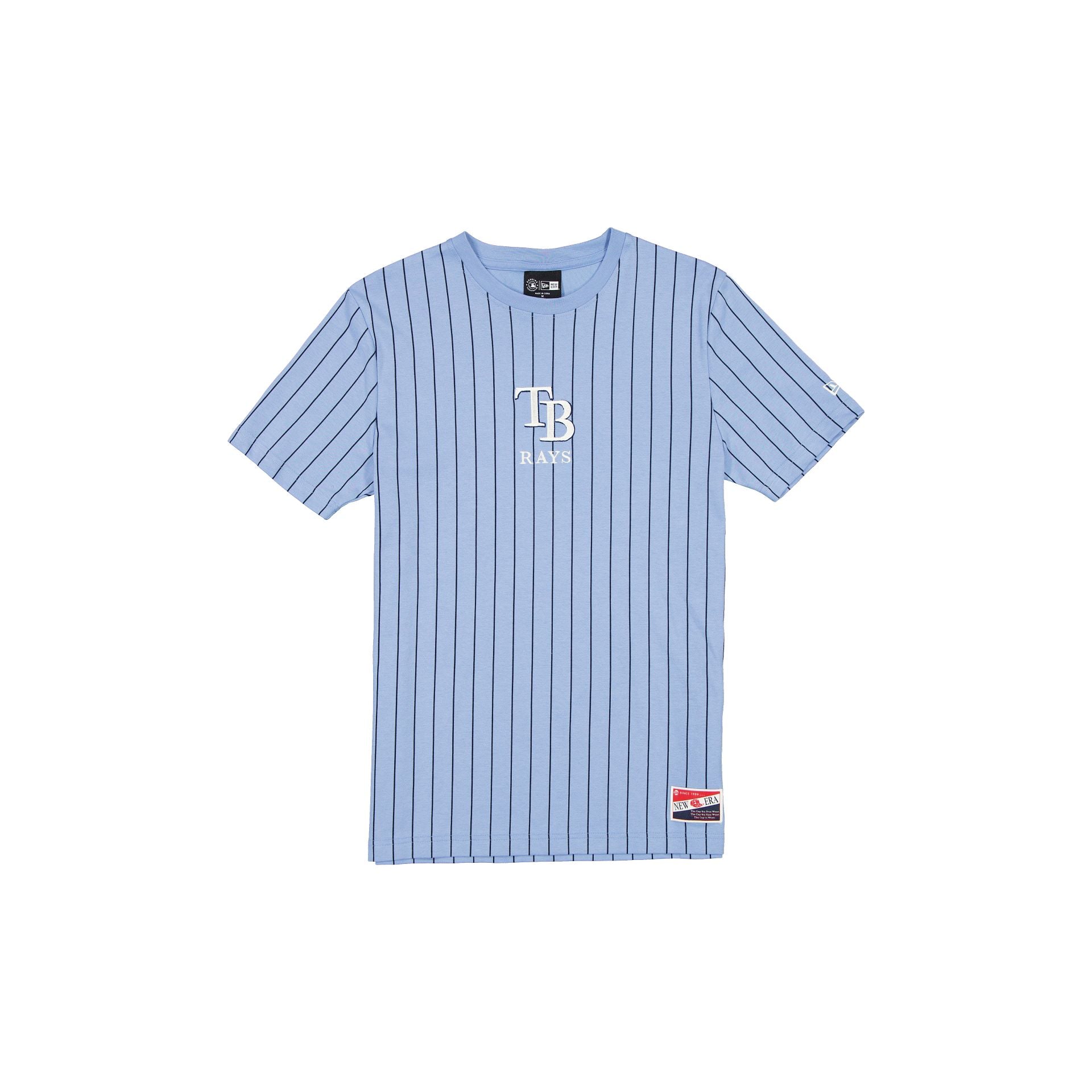 The Tampa Bay Rays Throwback Pinstripe T-Shirt features an embroidered Rays logo and wordmark at the front with a New Era jock tag at the left hip.