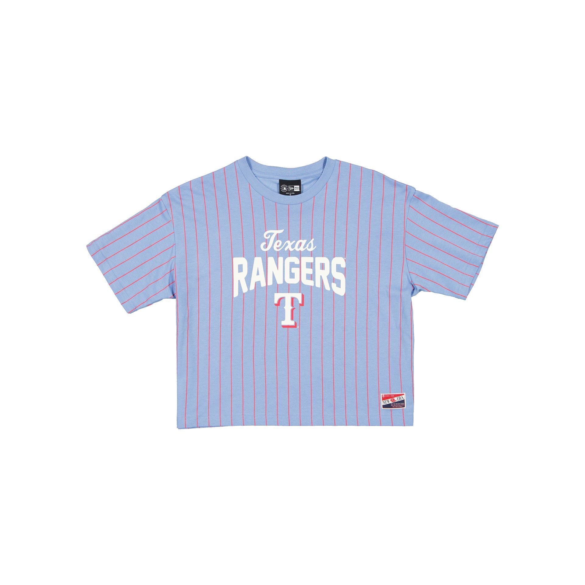 The Texas Rangers Throwback Women’s Pinstripe T-Shirt features a screen-printed Rangers wordmark and logo at the front with a New Era jock tag at the left hip.