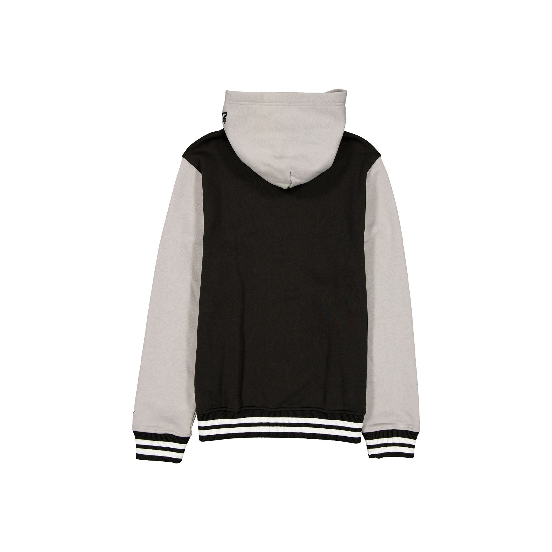 The Vegas Golden Knights Throwback Black Jacket features an embroidered chenille applique Golden Knights logo at the left chest with team patches at the front. Additional details include a snap button closure. pockets. and a hood.