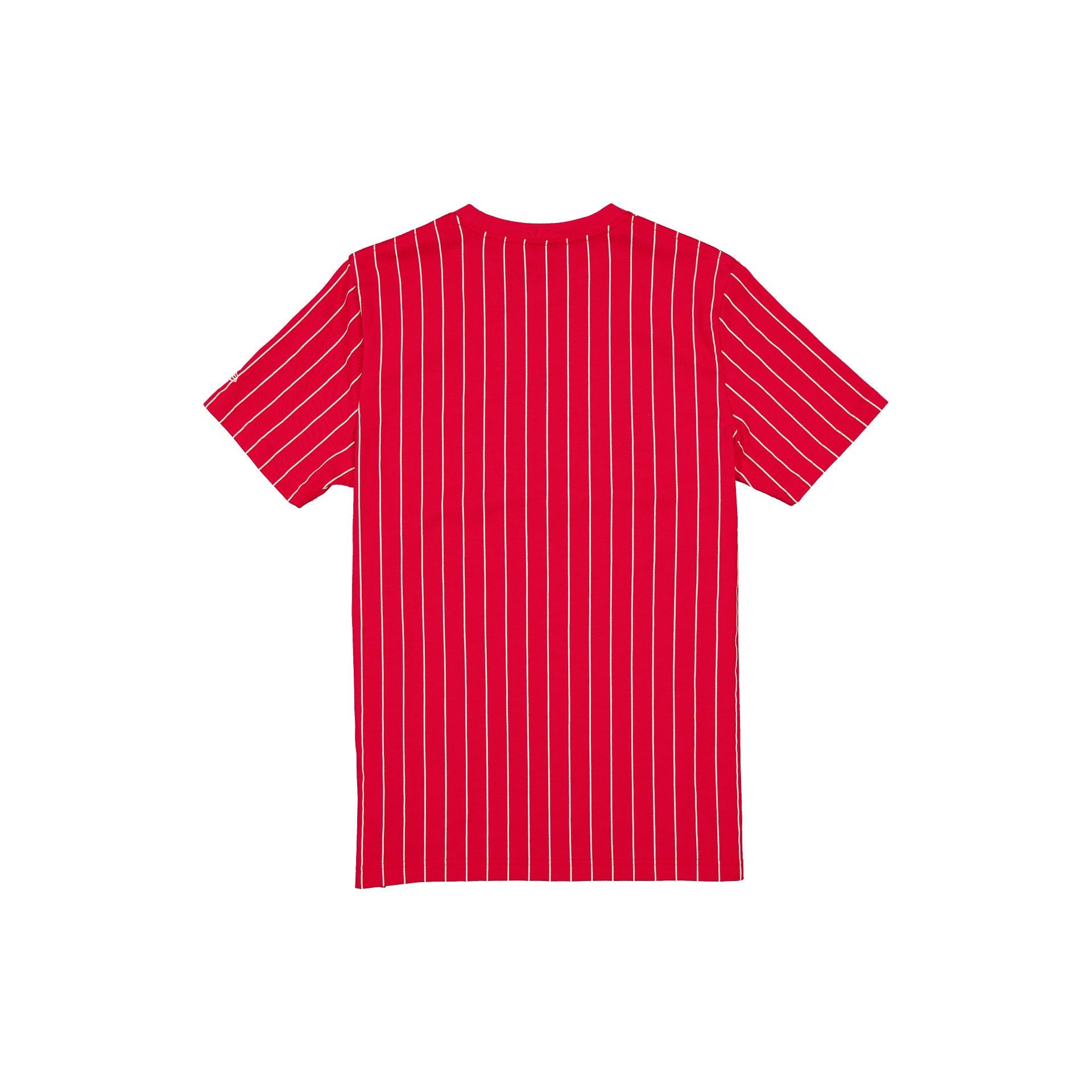 The Washington Nationals Throwback Pinstripe Wordmark T-Shirt features a twill applique Nationals wordmark and logo at the front with a New Era jock tag at the left hip.